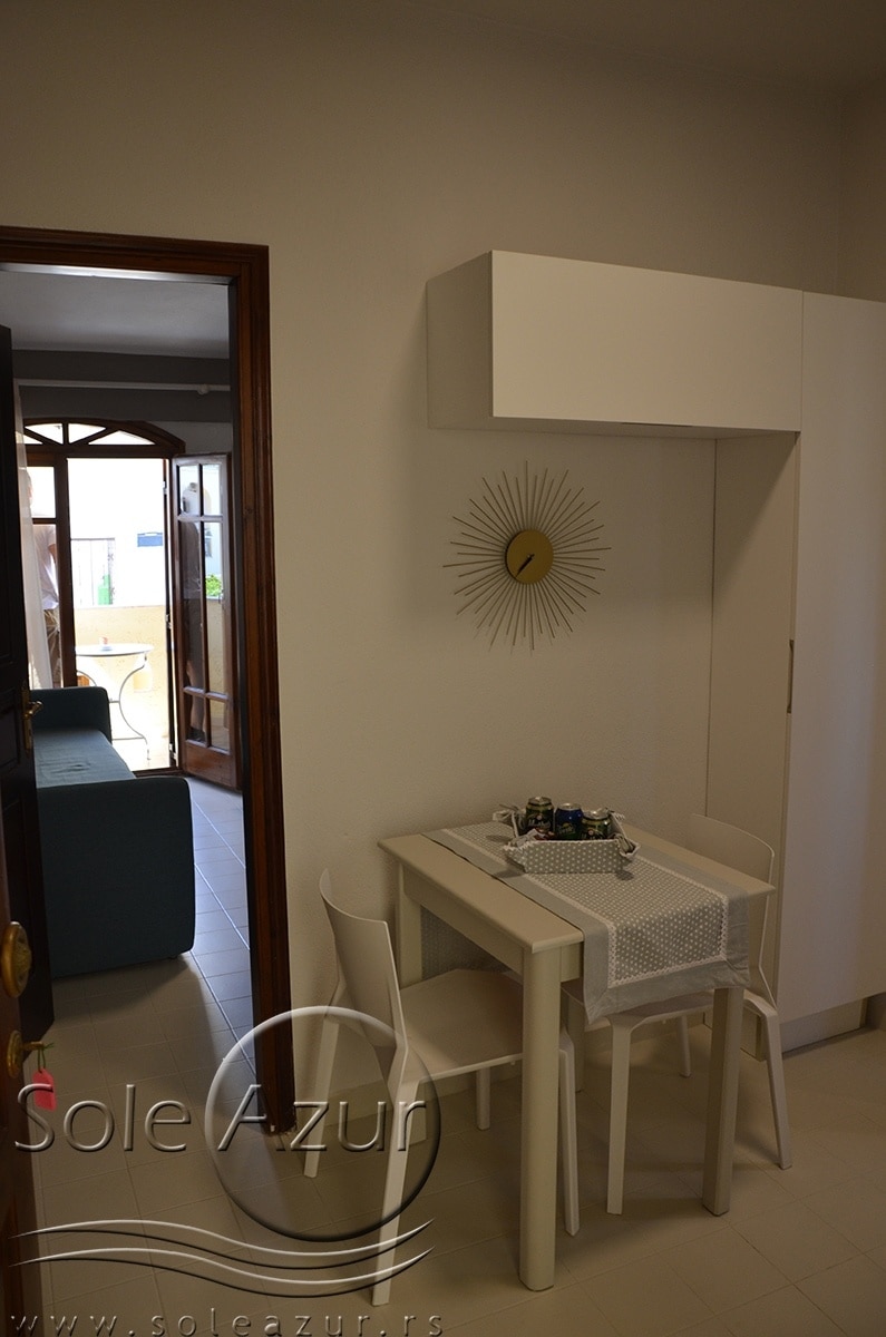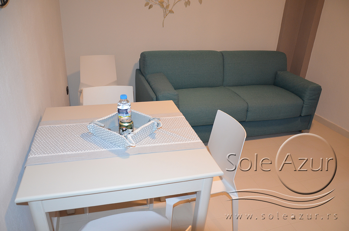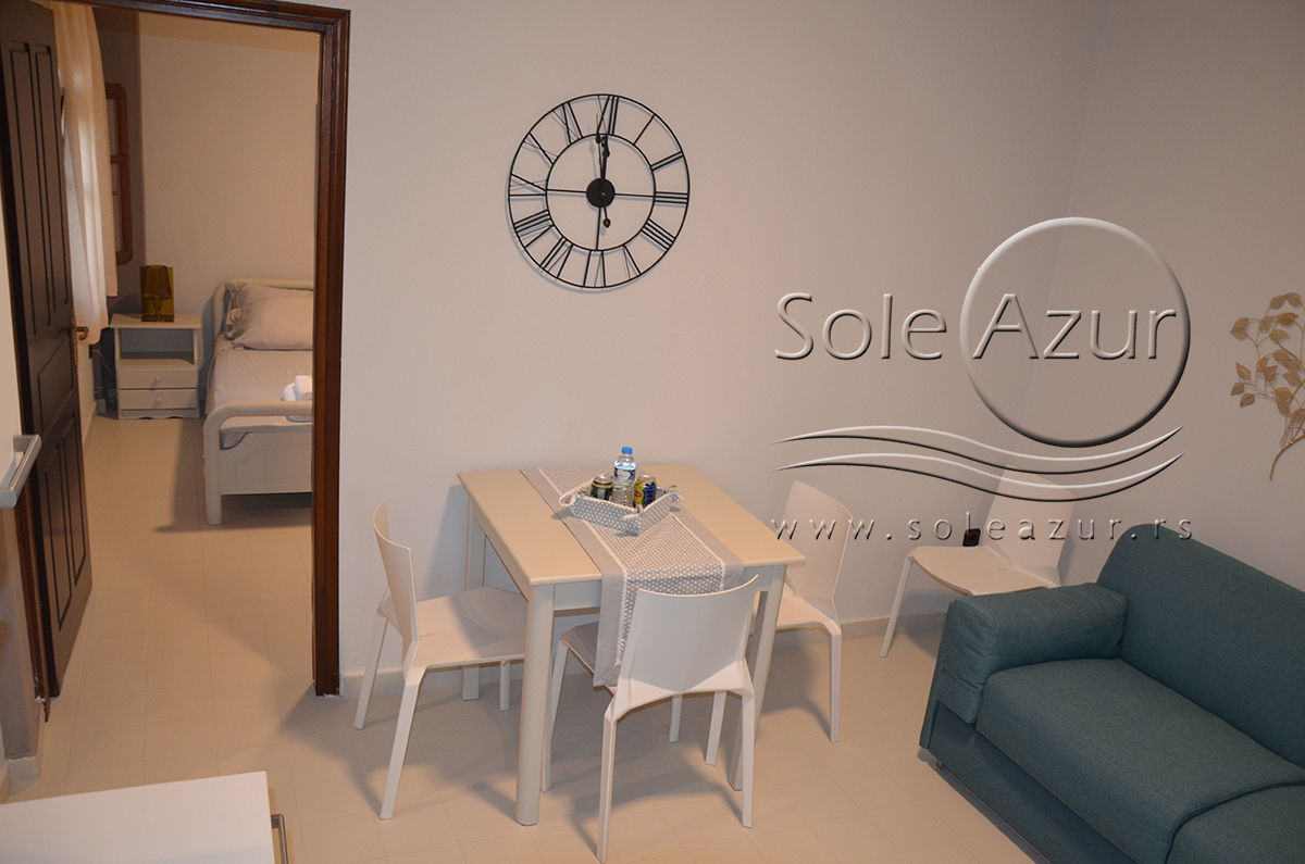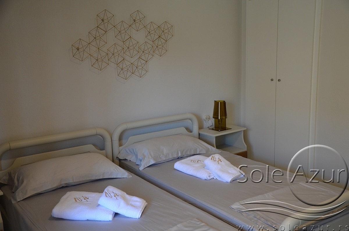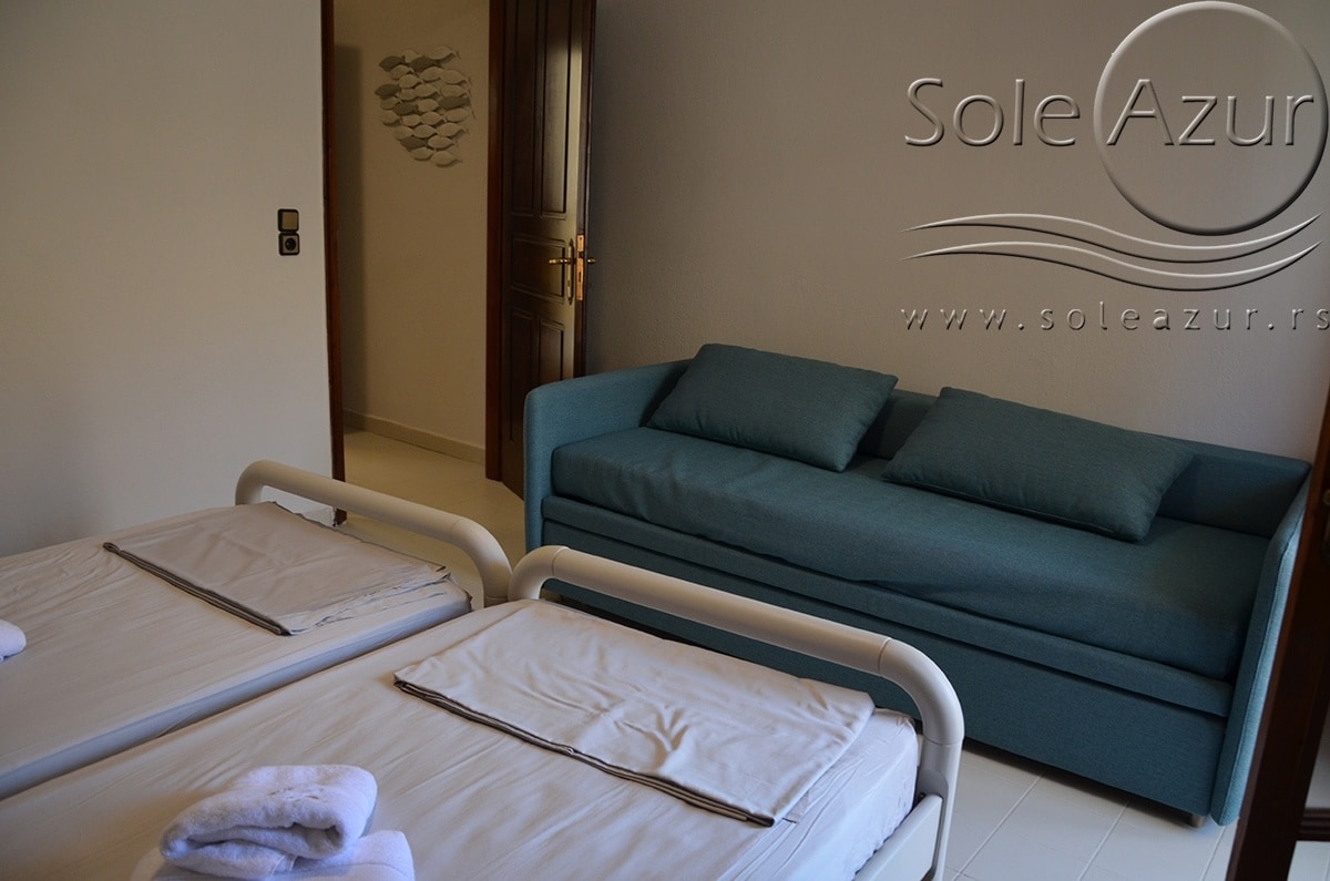 TROKREVETNI APARTMAN: Trokrevetni apartman se sastoji iz spavaće sobe koja u svom sastavu poseduje dva singl ležaja dimenzija 90x190cm kao sofa krevet dimenzija 190x80cm (takođe u pojedinim apartmanima treći ležaj može biti u sklopu kuhinjskog dela, dok se onda u spavaćoj sobi mogu nalaziti 2 singl lezaja), dva noćna stočića sa dve lampe, klima uređaj, TV, i ima izlaz na terasu, koja poseduje sto sa tri stolice. Druga prostorija je kuhinja sa trpezarijom u kojoj se nalaze sto sa tri stolice za ručavanje, dok je u sastavu kuhinje rešo sa dve ringle, kao i neophodno posuđe za tri osobe. Kupatilo se sastoji od tuš kabine manjih dimenzija. Usluga WI-FI internet konekcije je besplatna.