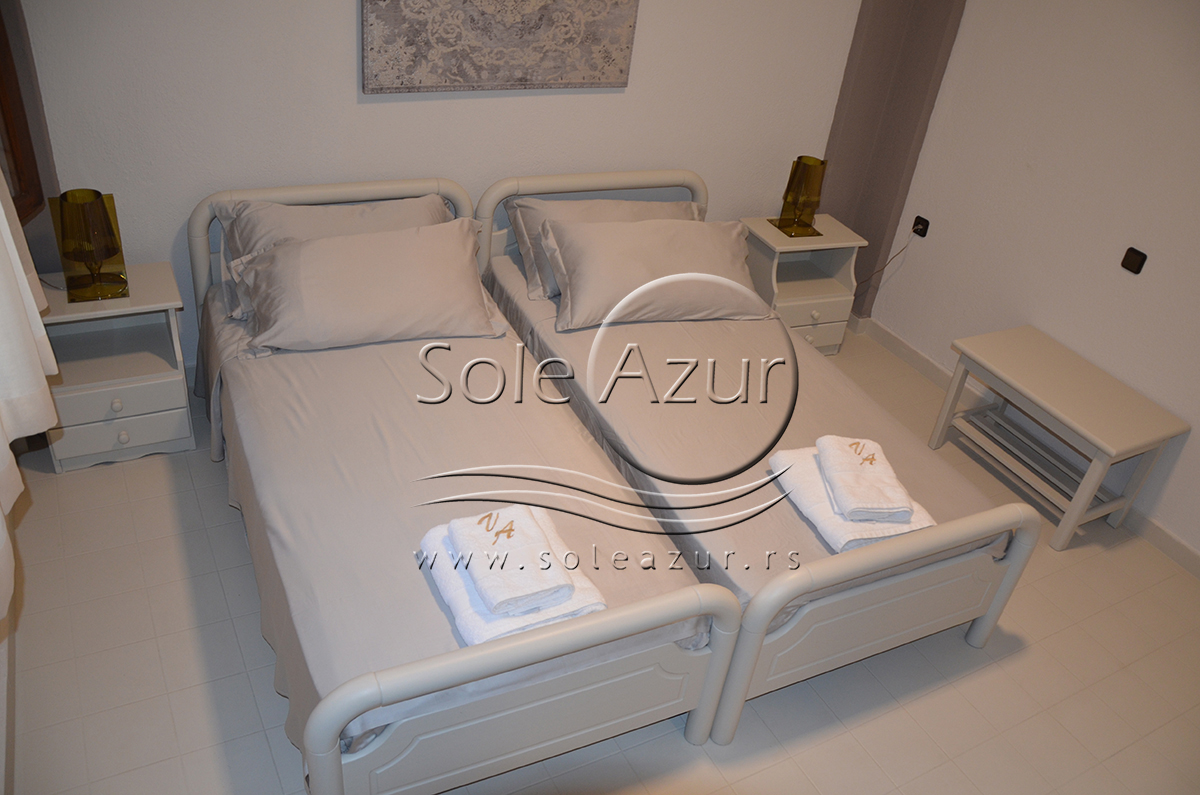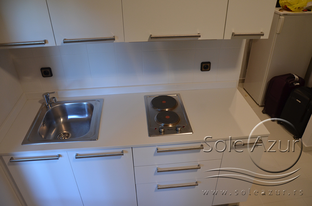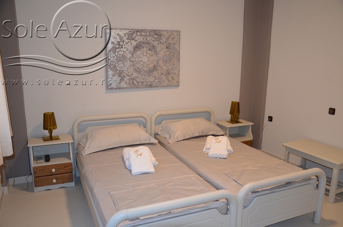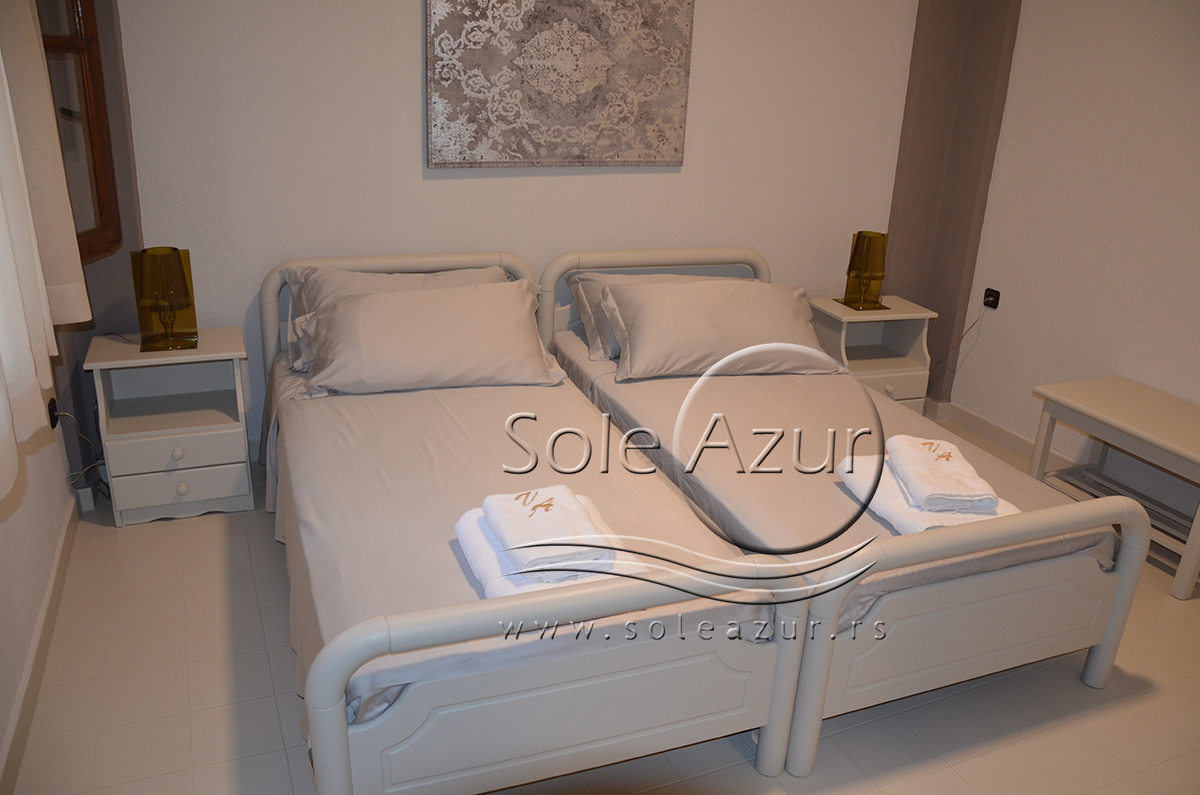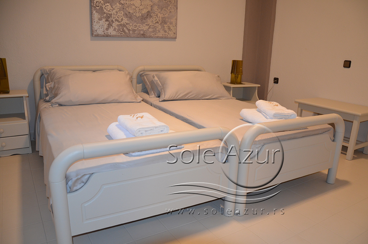 DVOKREVETNI STUDIJI: Dvokrevetni studiji se sastoje iz prostorije u kojoj se nalaze dva singl standardna ležaja dimenzija 90x190cm, dva noćna stočića, ormar, dve lampe, TV, klima uređaj, Kuhinja se nalazi u sklopu studija i od opreme poseduje rešo sa dve ringle, sudoperu, kao i neophodan kuhinjski pribor za dve osobe. Kupatilo u svom sastavu ima tuš kabinu , kao i po jedan veliki i jedan mali peškir po gostu. Terasa je komforna, i poseduje sto sa dve stolice. Usluga WI-FI internet konekcije je besplatna.