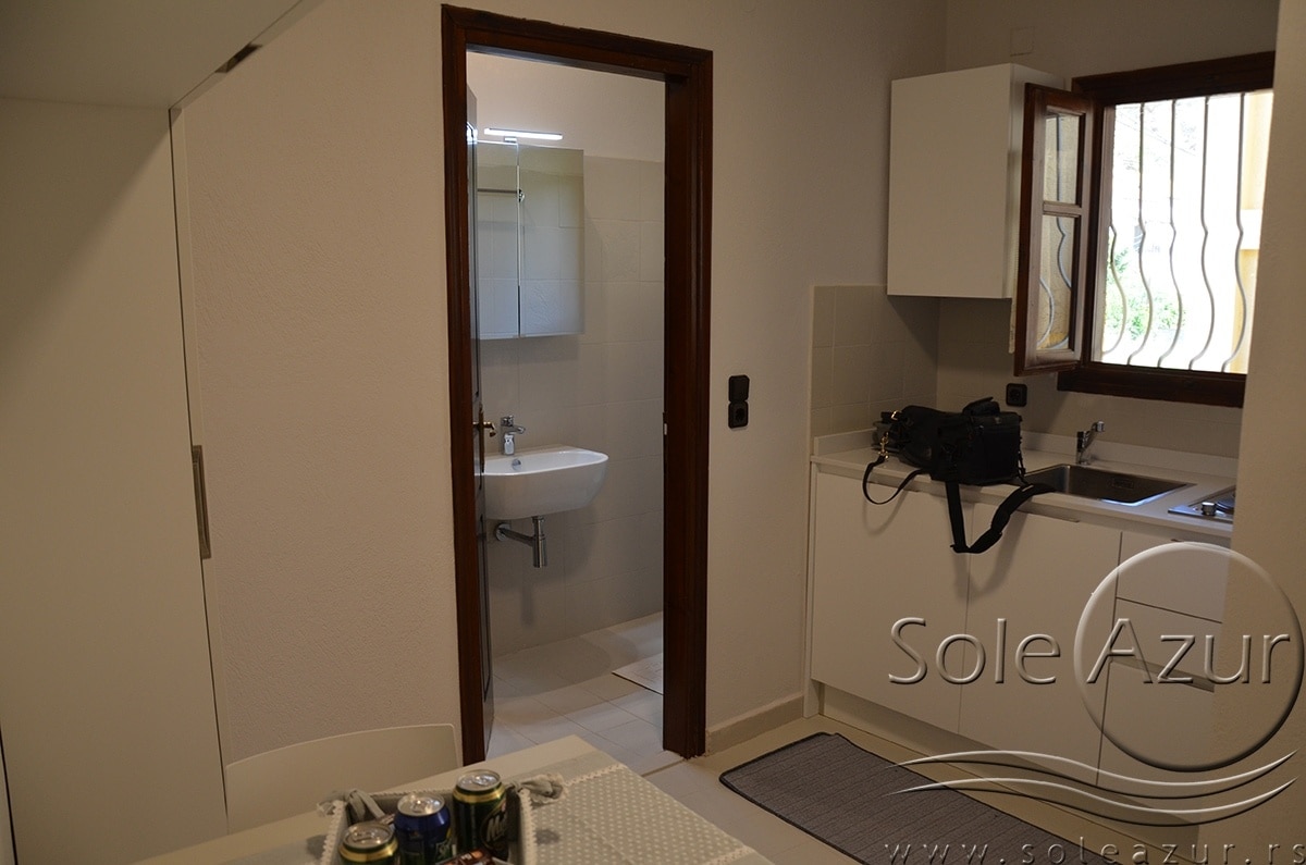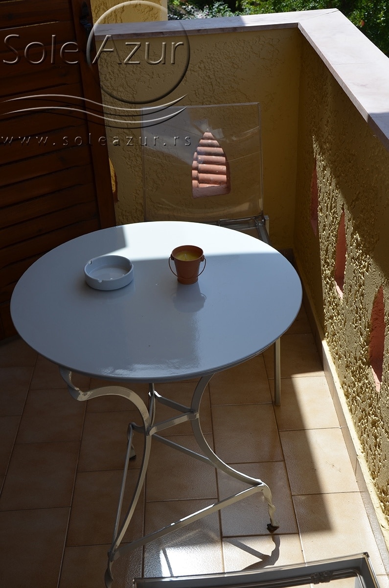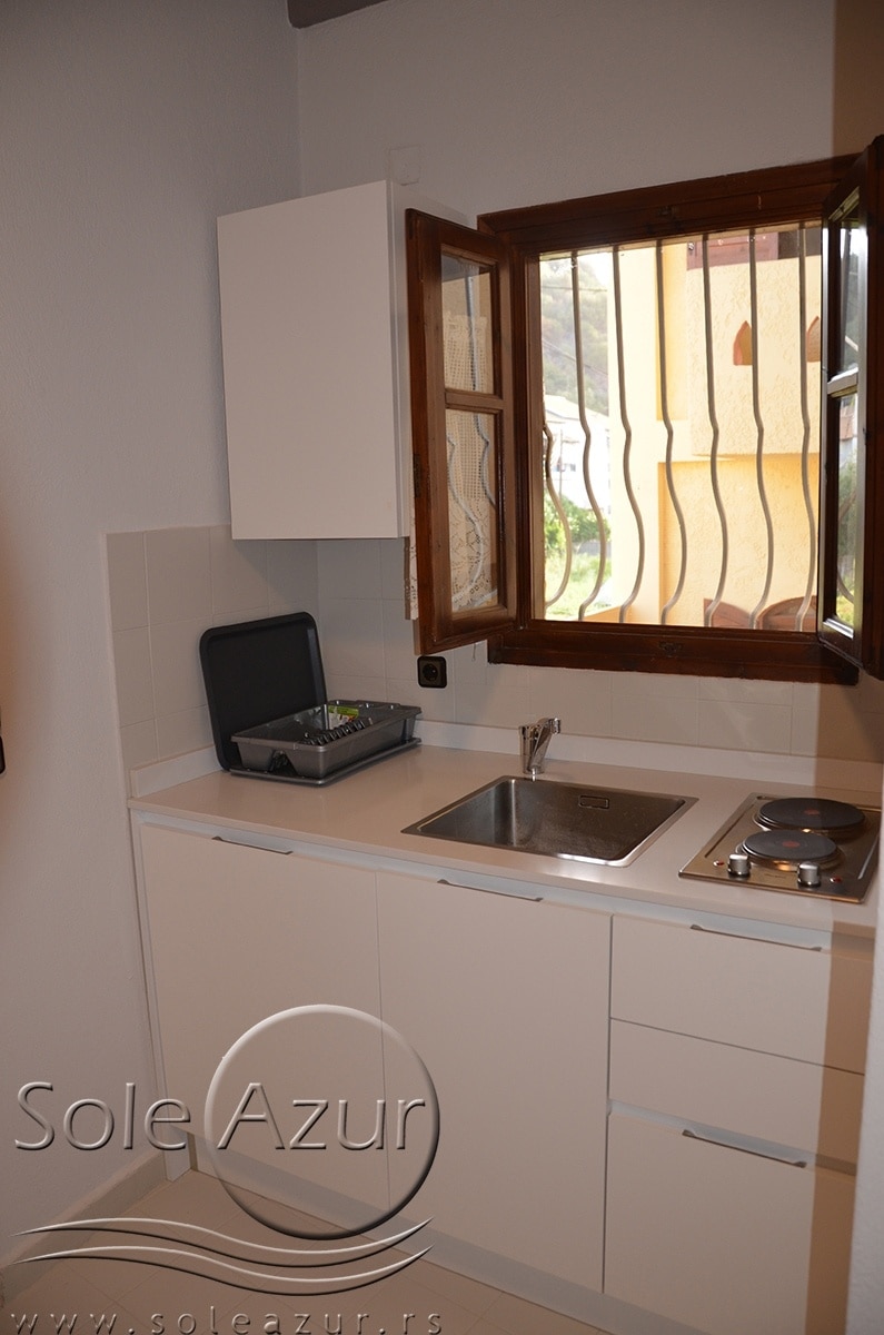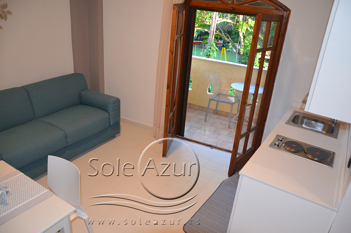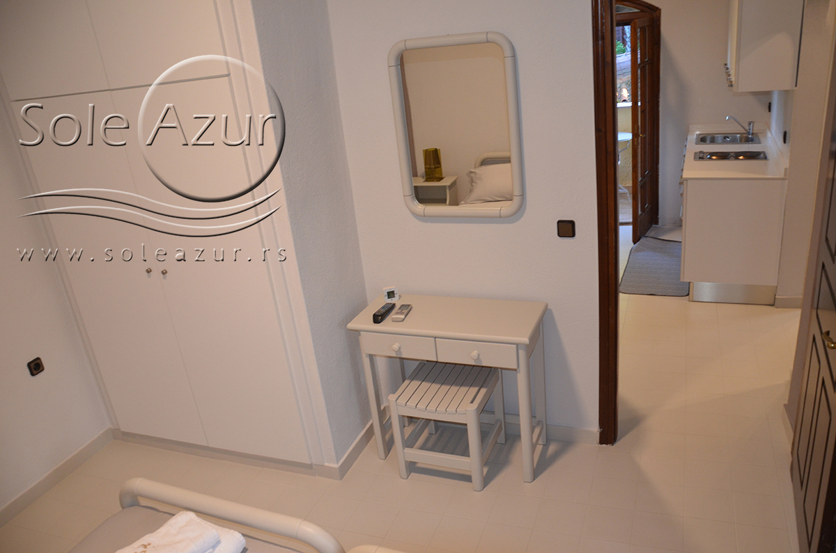 DVOKREVETNI STUDIJI: Dvokrevetni studiji se sastoje iz prostorije u kojoj se nalaze dva singl standardna ležaja dimenzija 90x190cm, dva noćna stočića, ormar, dve lampe, TV, klima uređaj, Kuhinja se nalazi u sklopu studija i od opreme poseduje rešo sa dve ringle, sudoperu, kao i neophodan kuhinjski pribor za dve osobe. Kupatilo u svom sastavu ima tuš kabinu , kao i po jedan veliki i jedan mali peškir po gostu. Terasa je komforna, i poseduje sto sa dve stolice. Usluga WI-FI internet konekcije je besplatna.