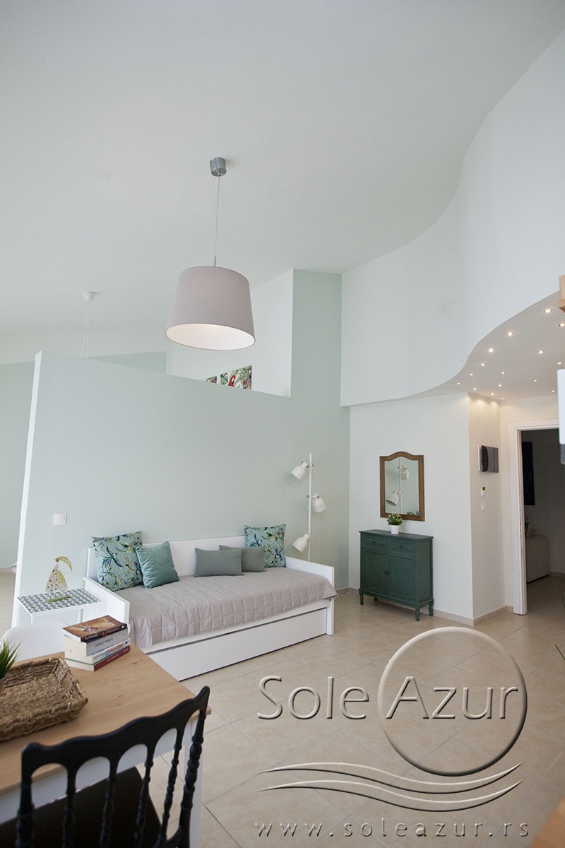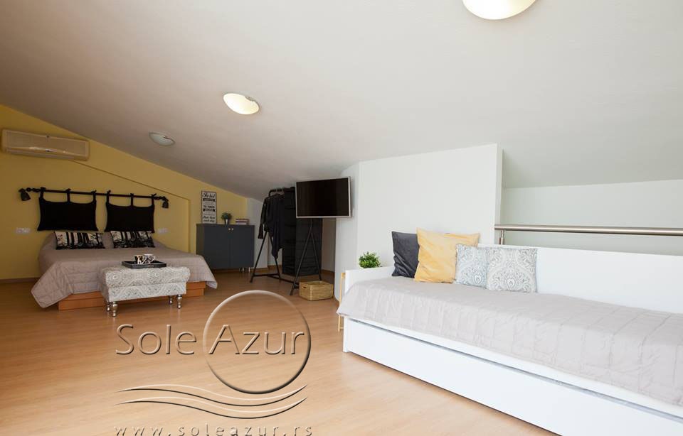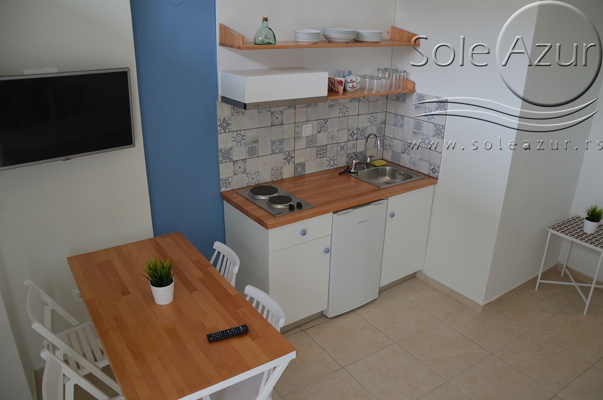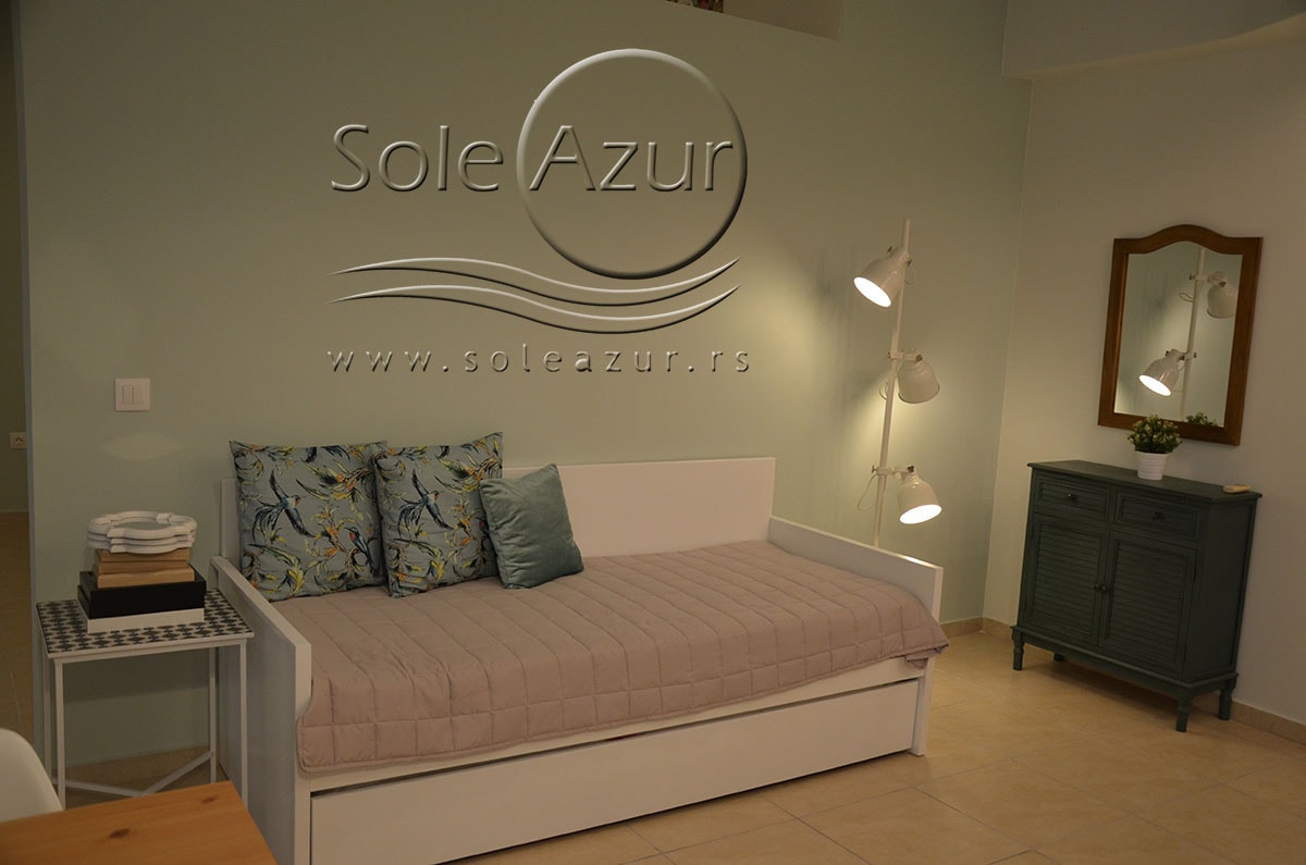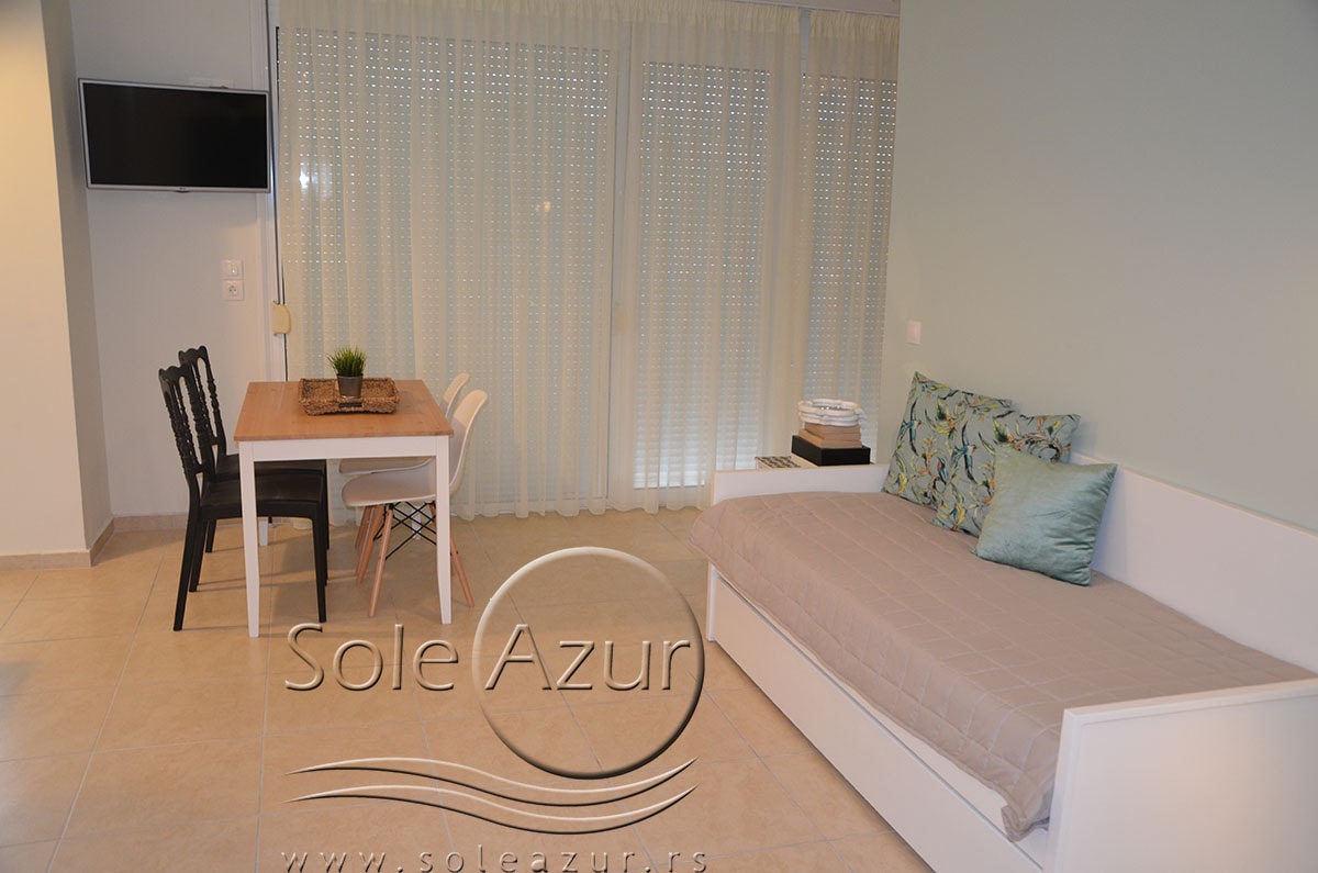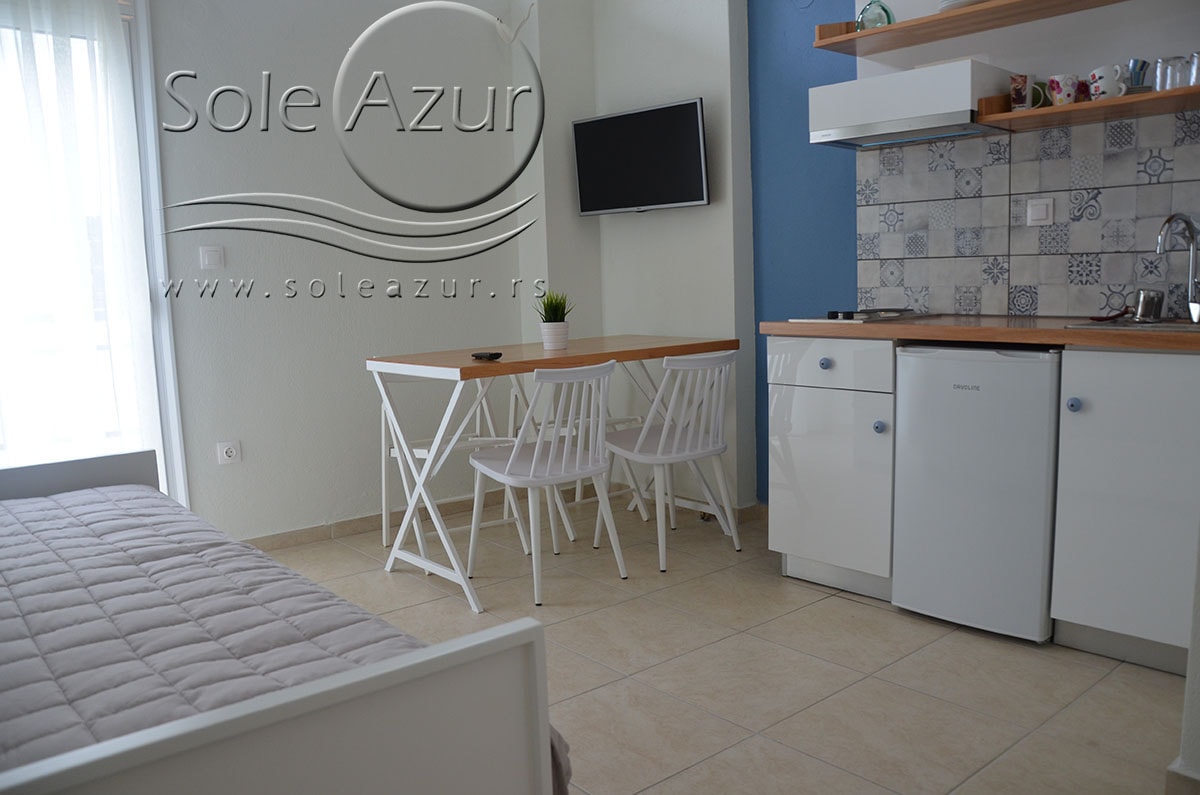 TROKREVETNI i ČETVOROKREVETNI STUDIO (2 sprat): trokrevetni i četvorokrevetni studio u svom sastavu poseduju jedan francuski ležaj (dimenzija 200x160cm), prostor za odlaganje stvari (pitati u agenciji), manji ormar, TV, klima uređaj, sofu za sedenje, koja je ujedno i ležaj za treću osobu (dimenzija 190x80cm). Iz sofe se izvlači još jedan ležaj (dimenzija 185x75cm), tako da mogu da spavaju četiri osobe. U sklopu prostorije se nalazi kuhinja, koja je u potpunosti opremljena posuđem za tri/četiri osobe. Poseduje i frižider, šporet sa dve ringle, aspirator. Kupatilo je veliko i sadrži zastakljenu tuš kabinu. Studio poseduje terasu sa stolom i četiri stolice, ali zbog svoje specifičnosti naglasavamo da terasa nema pogled, jer su zidovi sa tri strane, ali postoji i tenda koja zaklanja sunce po potrebi.
