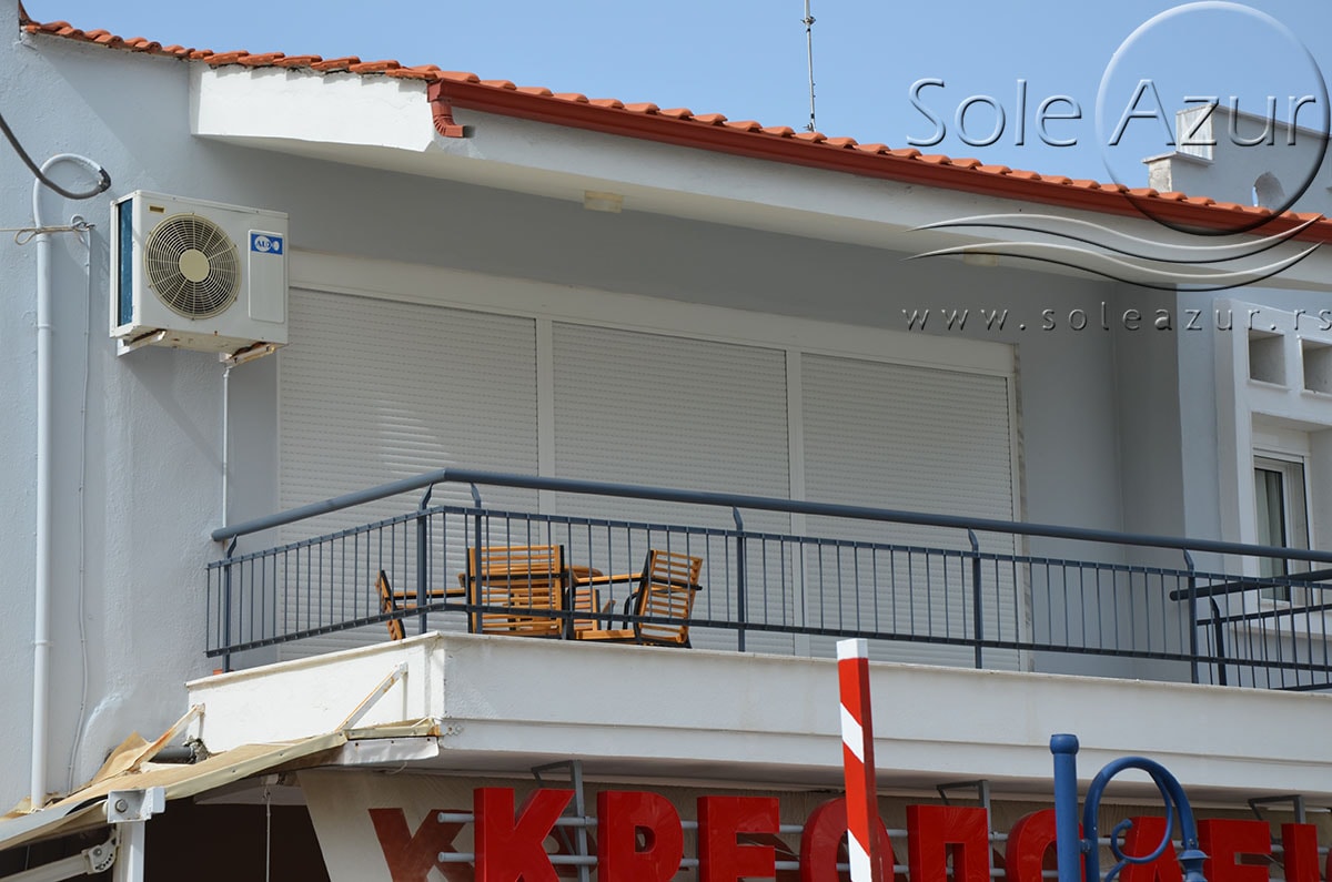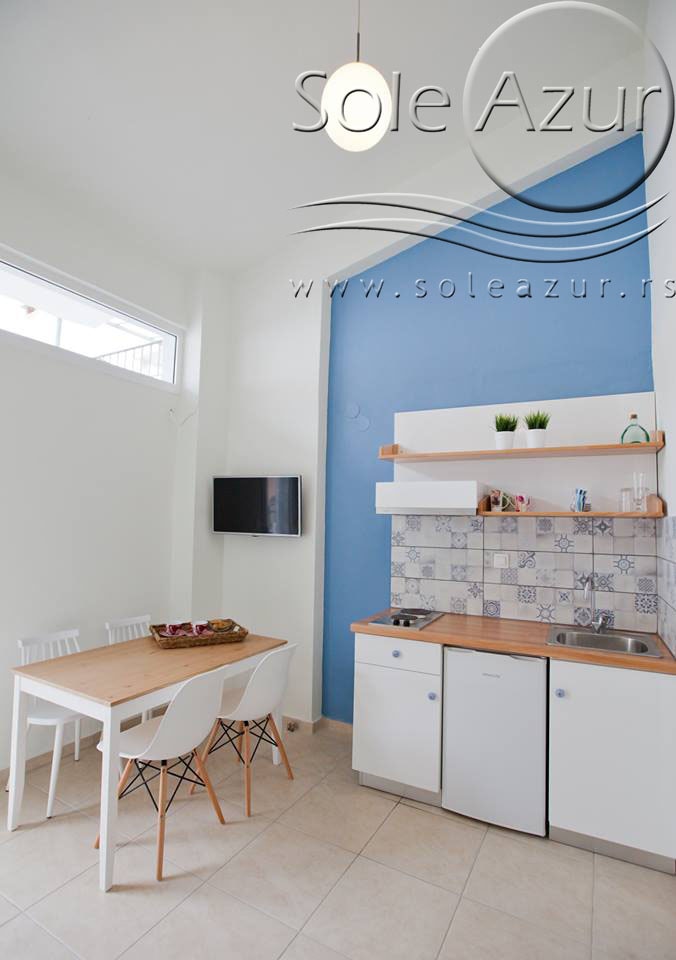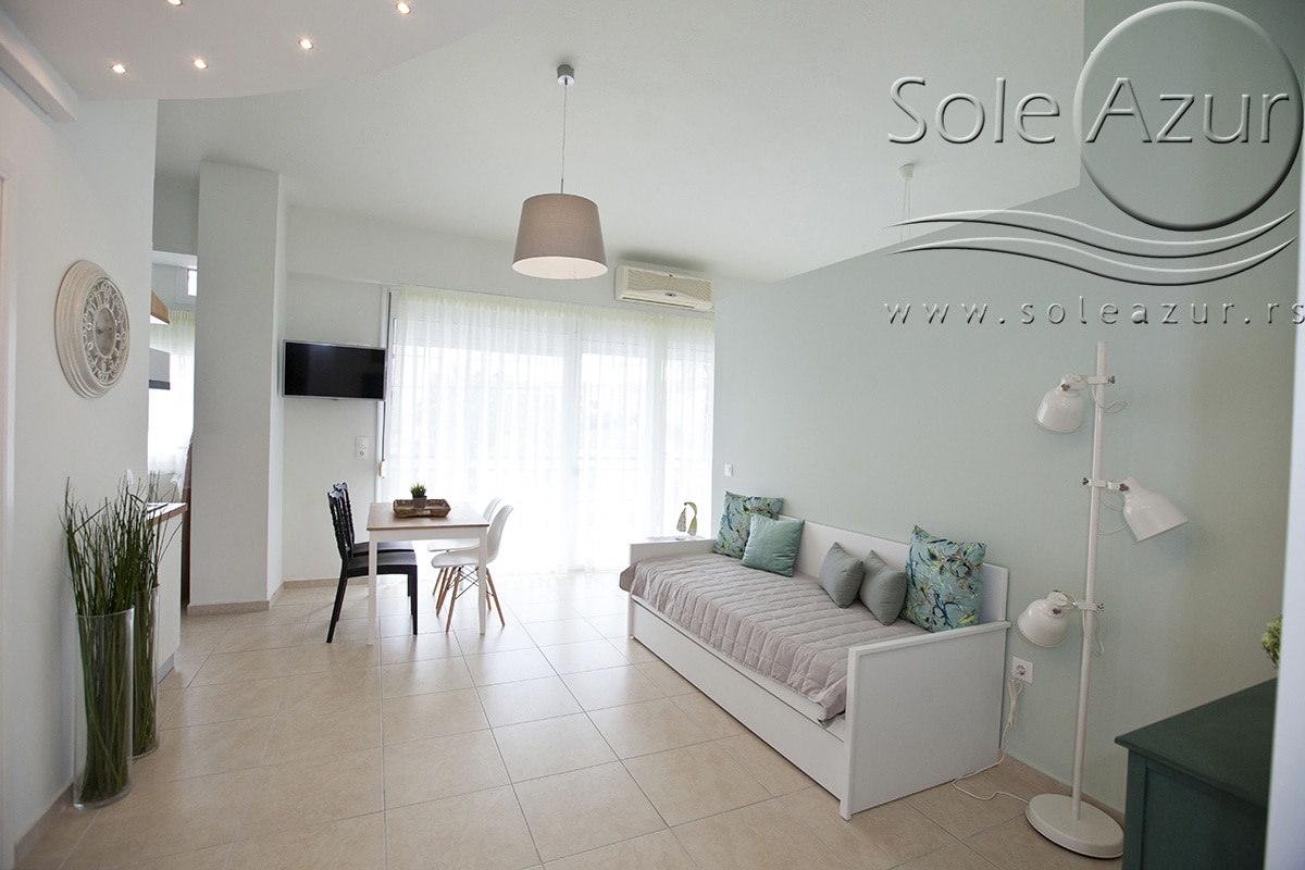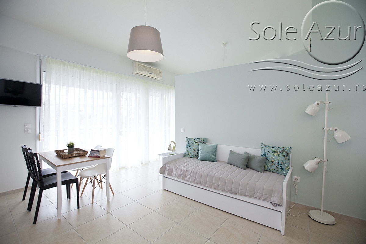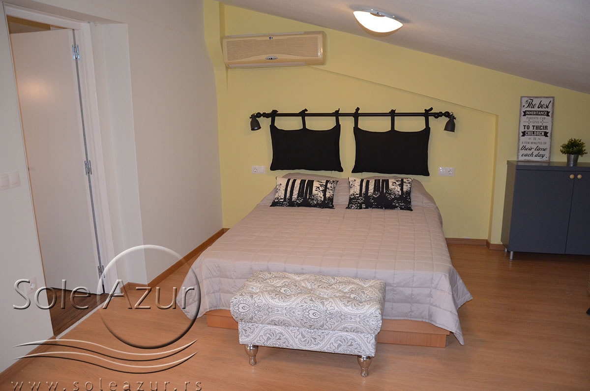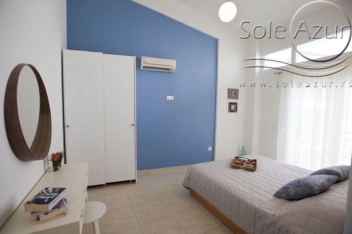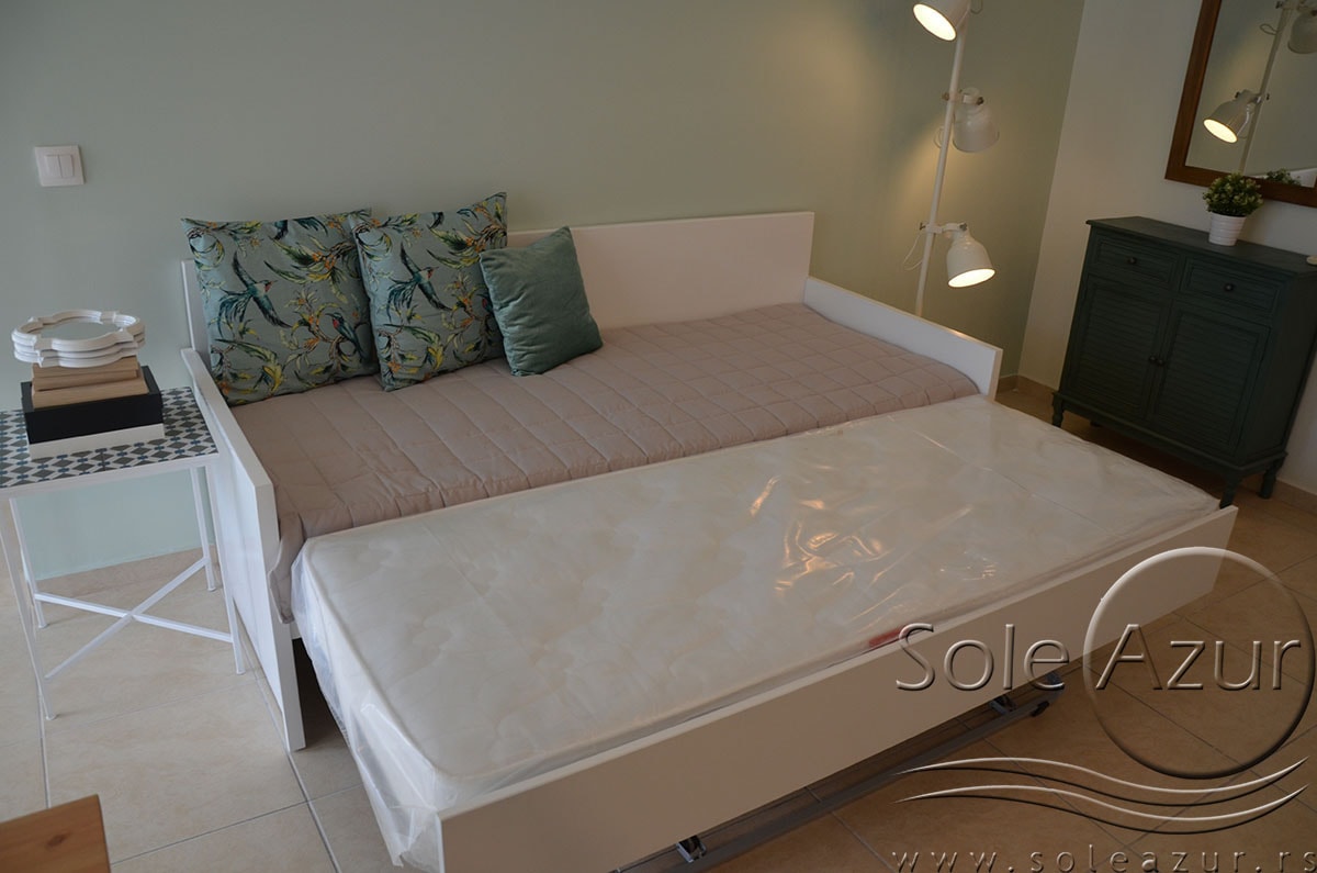 TROKREVETNI i ČETVOROKREVETNI STUDIO (2 sprat): trokrevetni i četvorokrevetni studio u svom sastavu poseduju jedan francuski ležaj (dimenzija 200x160cm), prostor za odlaganje stvari (pitati u agenciji), manji ormar, TV, klima uređaj, sofu za sedenje, koja je ujedno i ležaj za treću osobu (dimenzija 190x80cm). Iz sofe se izvlači još jedan ležaj (dimenzija 185x75cm), tako da mogu da spavaju četiri osobe. U sklopu prostorije se nalazi kuhinja, koja je u potpunosti opremljena posuđem za tri/četiri osobe. Poseduje i frižider, šporet sa dve ringle, aspirator. Kupatilo je veliko i sadrži zastakljenu tuš kabinu. Studio poseduje terasu sa stolom i četiri stolice, ali zbog svoje specifičnosti naglasavamo da terasa nema pogled, jer su zidovi sa tri strane, ali postoji i tenda koja zaklanja sunce po potrebi.