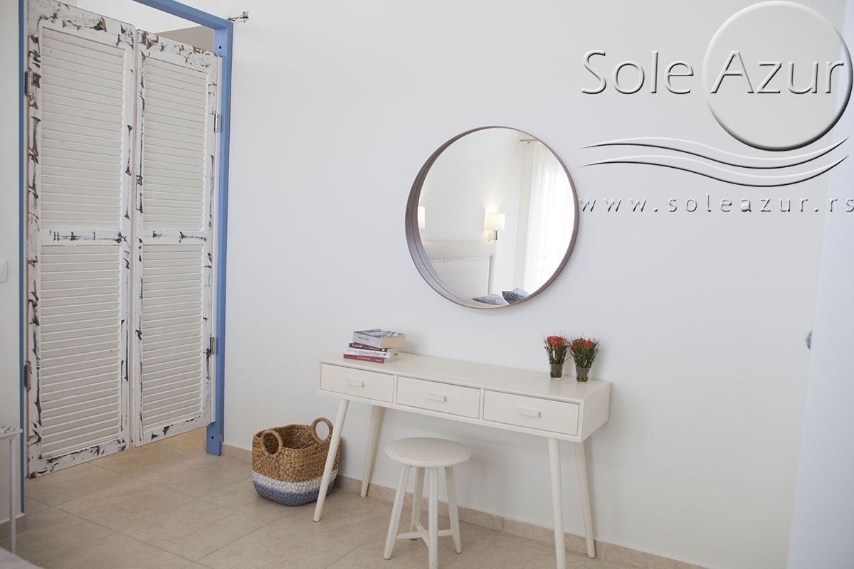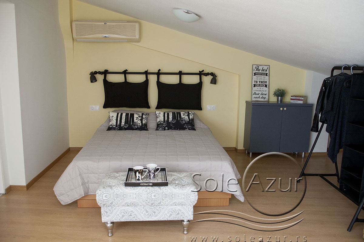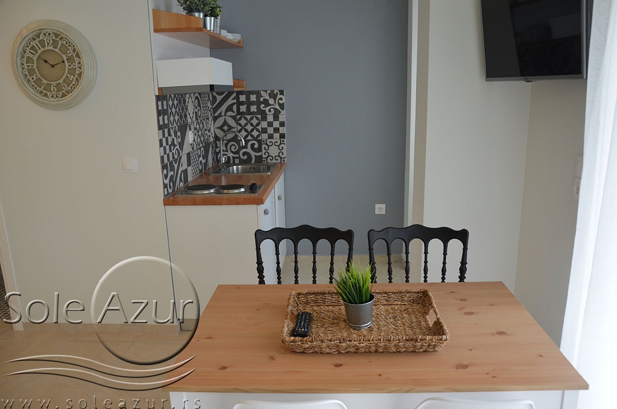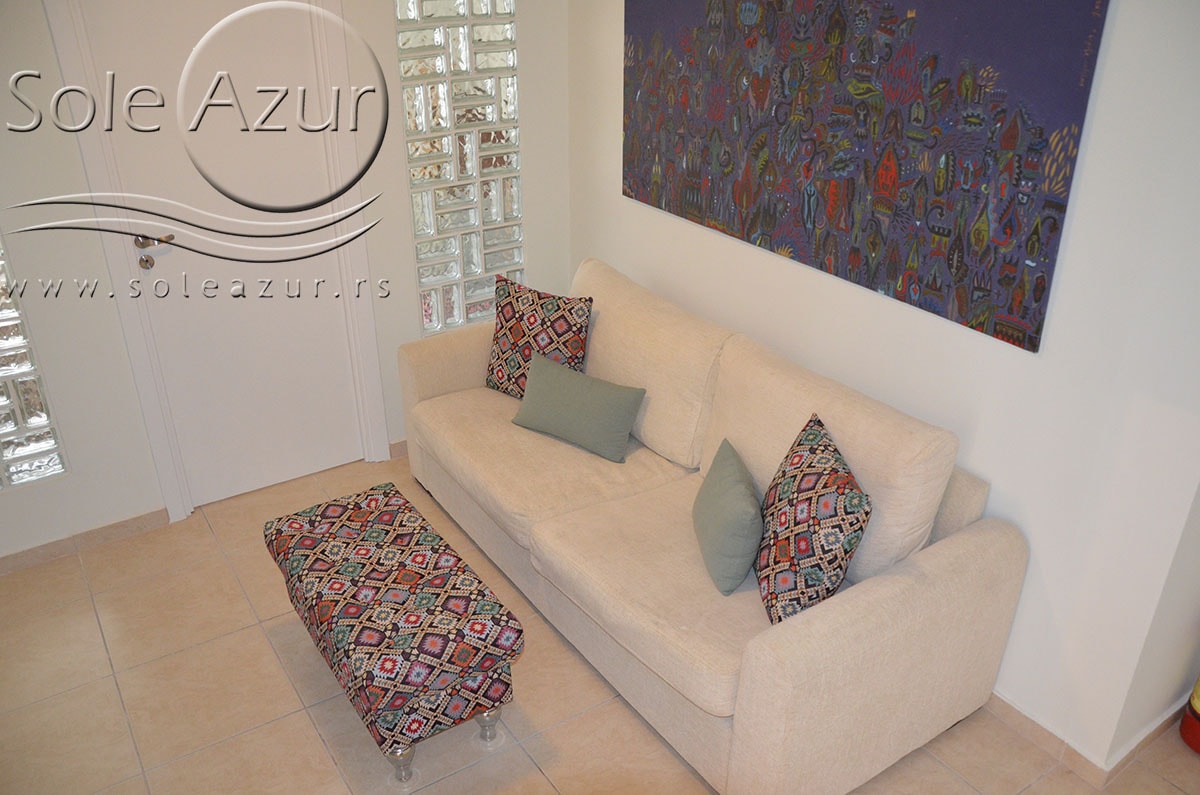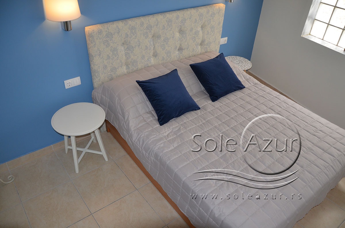 TROKREVETNI i ČETVOROKREVETNI STUDIO (2 sprat): trokrevetni i četvorokrevetni studio u svom sastavu poseduju jedan francuski ležaj (dimenzija 200x160cm), prostor za odlaganje stvari (pitati u agenciji), manji ormar, TV, klima uređaj, sofu za sedenje, koja je ujedno i ležaj za treću osobu (dimenzija 190x80cm). Iz sofe se izvlači još jedan ležaj (dimenzija 185x75cm), tako da mogu da spavaju četiri osobe. U sklopu prostorije se nalazi kuhinja, koja je u potpunosti opremljena posuđem za tri/četiri osobe. Poseduje i frižider, šporet sa dve ringle, aspirator. Kupatilo je veliko i sadrži zastakljenu tuš kabinu. Studio poseduje terasu sa stolom i četiri stolice, ali zbog svoje specifičnosti naglasavamo da terasa nema pogled, jer su zidovi sa tri strane, ali postoji i tenda koja zaklanja sunce po potrebi.