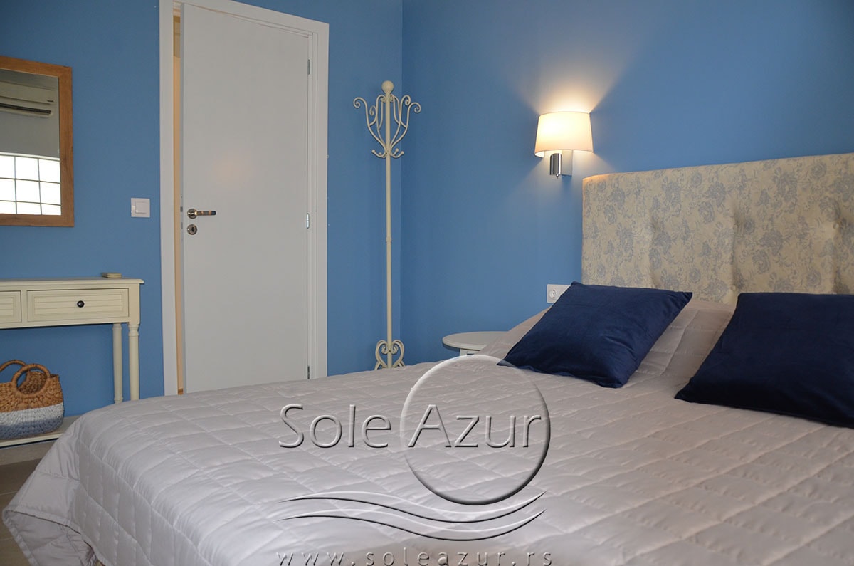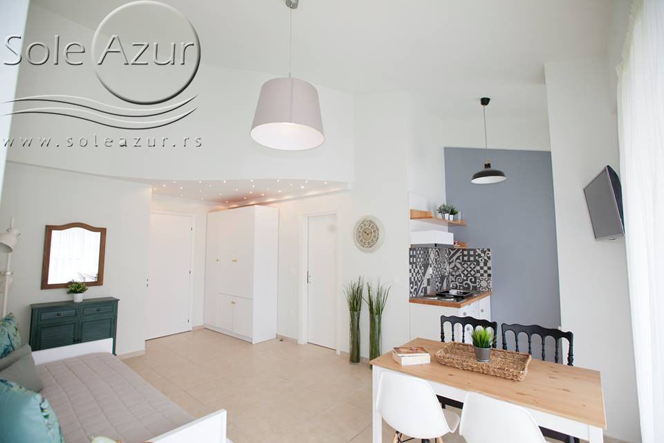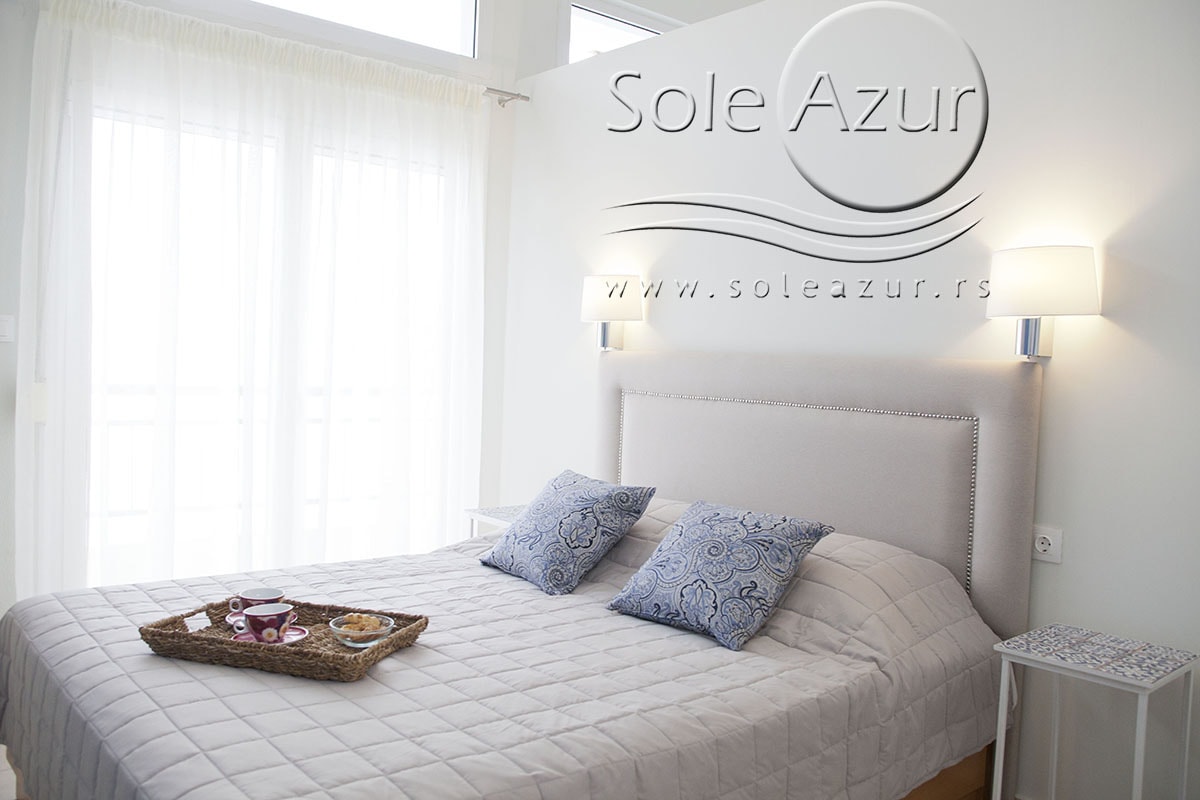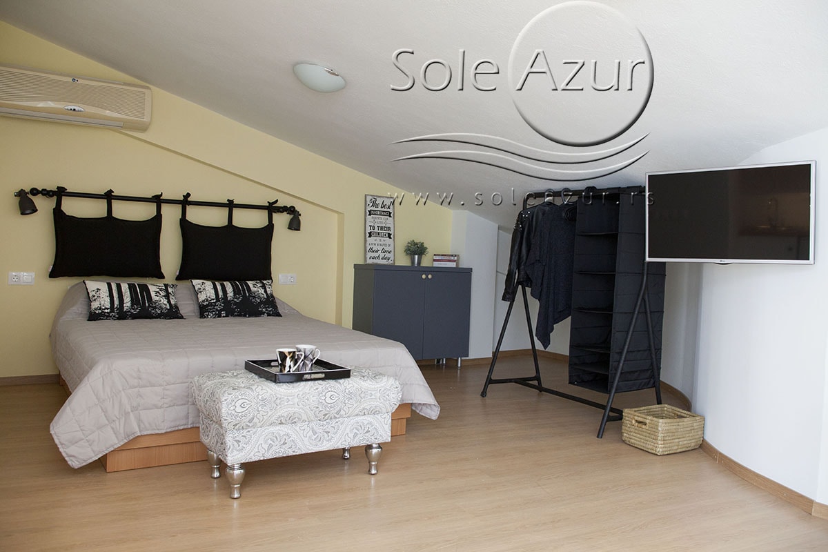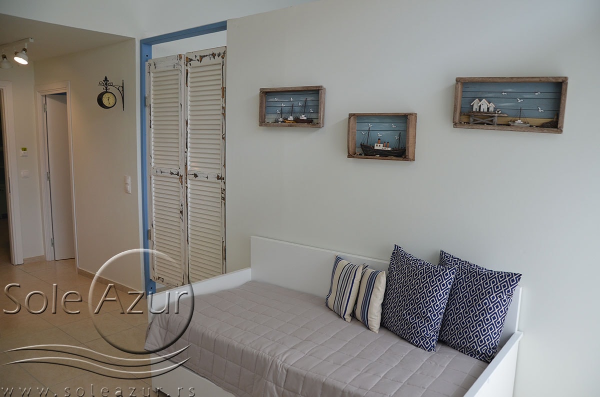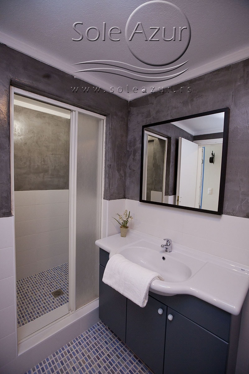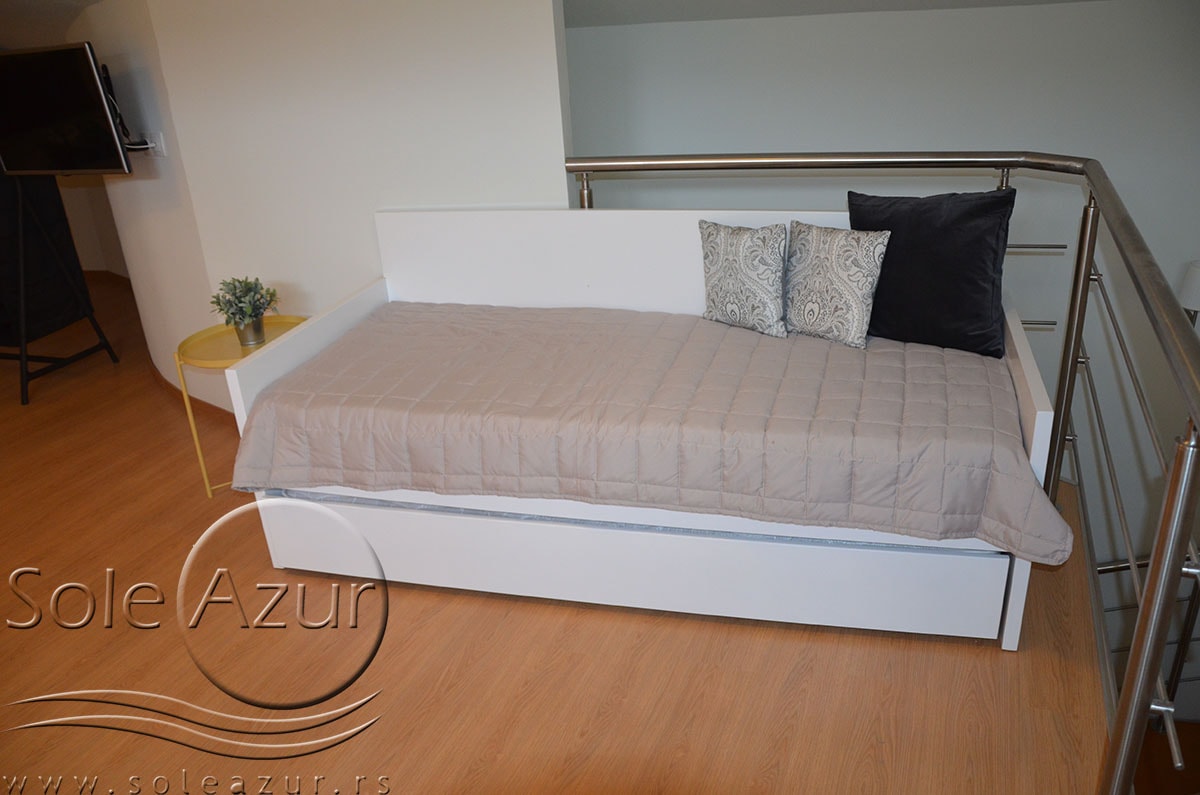 TROKREVETNI i ČETVOROKREVETNI STUDIO (2 sprat): trokrevetni i četvorokrevetni studio u svom sastavu poseduju jedan francuski ležaj (dimenzija 200x160cm), prostor za odlaganje stvari (pitati u agenciji), manji ormar, TV, klima uređaj, sofu za sedenje, koja je ujedno i ležaj za treću osobu (dimenzija 190x80cm). Iz sofe se izvlači još jedan ležaj (dimenzija 185x75cm), tako da mogu da spavaju četiri osobe. U sklopu prostorije se nalazi kuhinja, koja je u potpunosti opremljena posuđem za tri/četiri osobe. Poseduje i frižider, šporet sa dve ringle, aspirator. Kupatilo je veliko i sadrži zastakljenu tuš kabinu. Studio poseduje terasu sa stolom i četiri stolice, ali zbog svoje specifičnosti naglasavamo da terasa nema pogled, jer su zidovi sa tri strane, ali postoji i tenda koja zaklanja sunce po potrebi.