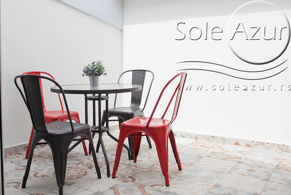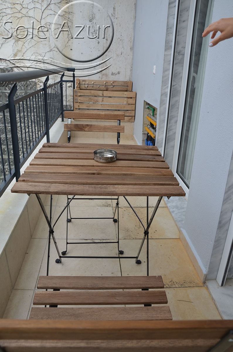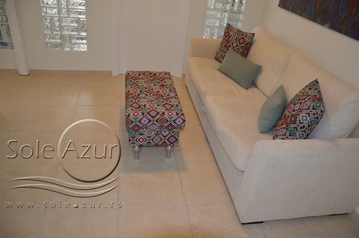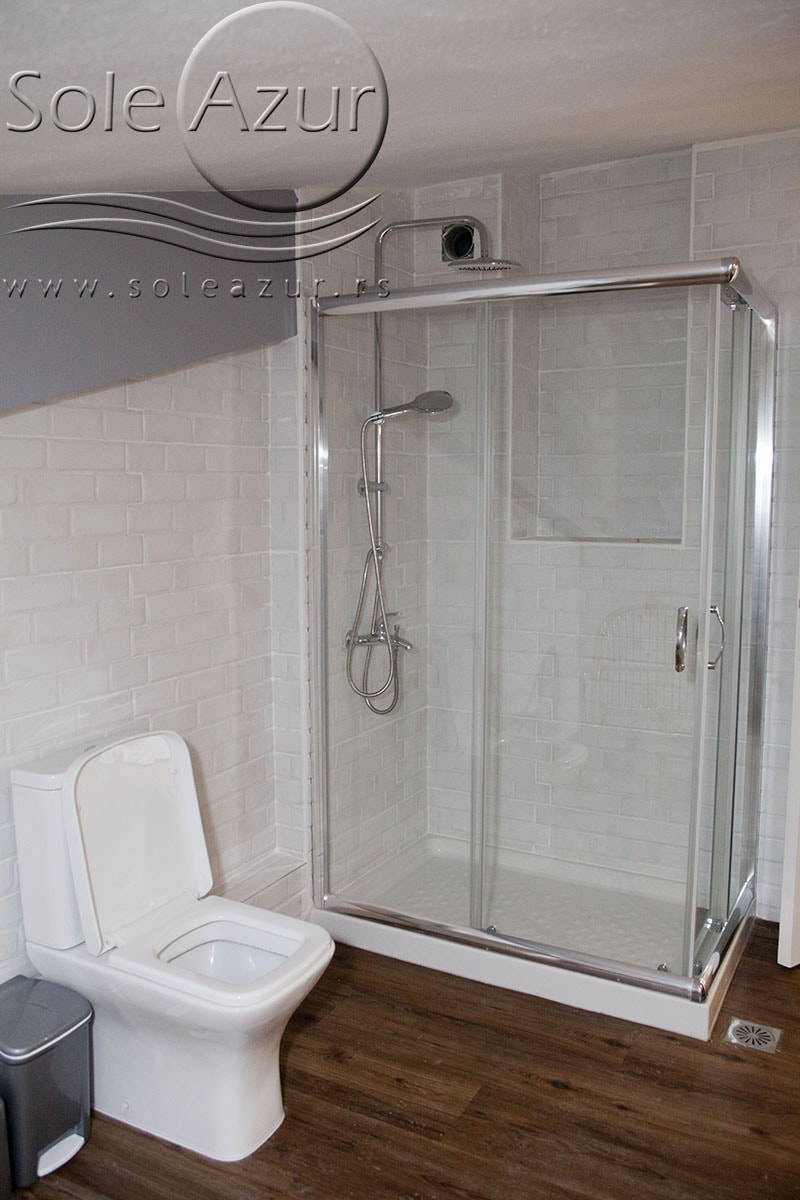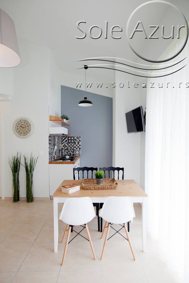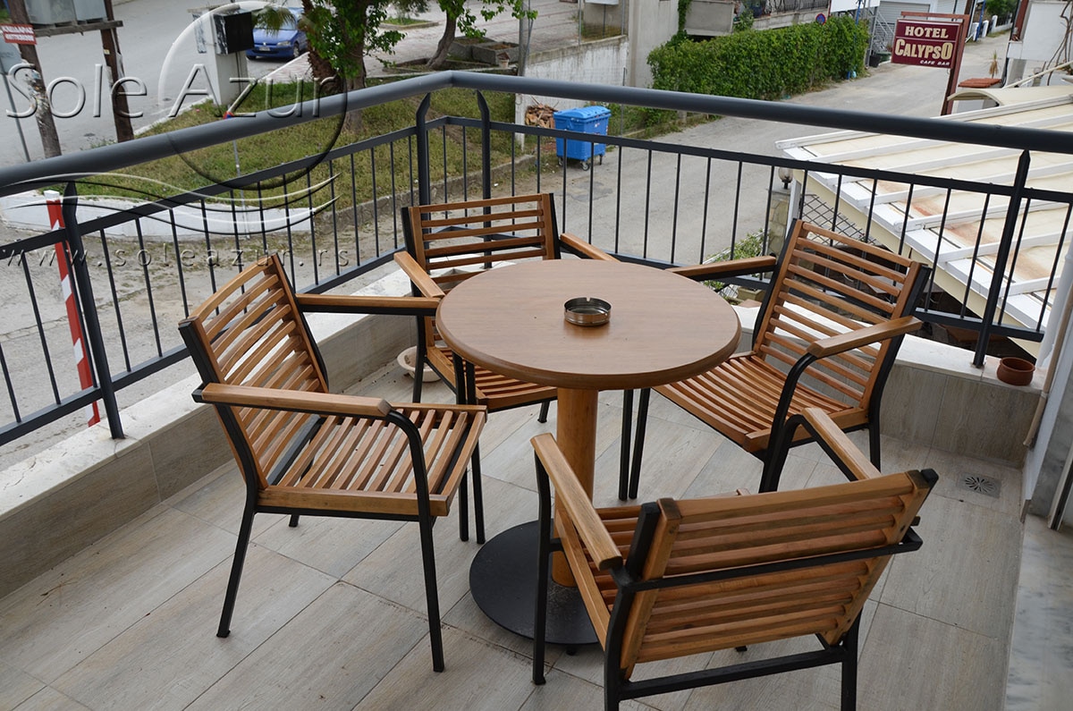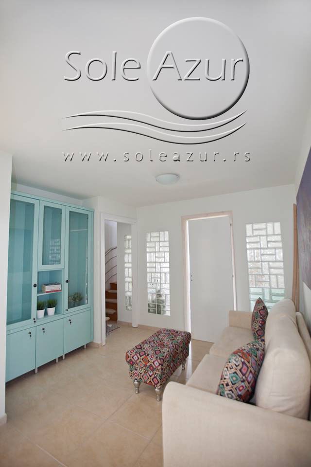 TROKREVETNI i ČETVOROKREVETNI STUDIO (2 sprat): trokrevetni i četvorokrevetni studio u svom sastavu poseduju jedan francuski ležaj (dimenzija 200x160cm), prostor za odlaganje stvari (pitati u agenciji), manji ormar, TV, klima uređaj, sofu za sedenje, koja je ujedno i ležaj za treću osobu (dimenzija 190x80cm). Iz sofe se izvlači još jedan ležaj (dimenzija 185x75cm), tako da mogu da spavaju četiri osobe. U sklopu prostorije se nalazi kuhinja, koja je u potpunosti opremljena posuđem za tri/četiri osobe. Poseduje i frižider, šporet sa dve ringle, aspirator. Kupatilo je veliko i sadrži zastakljenu tuš kabinu. Studio poseduje terasu sa stolom i četiri stolice, ali zbog svoje specifičnosti naglasavamo da terasa nema pogled, jer su zidovi sa tri strane, ali postoji i tenda koja zaklanja sunce po potrebi.