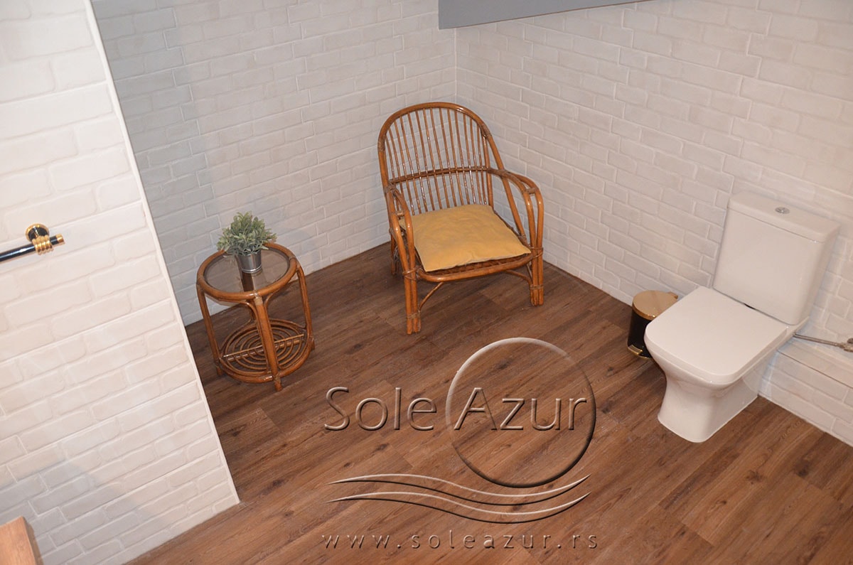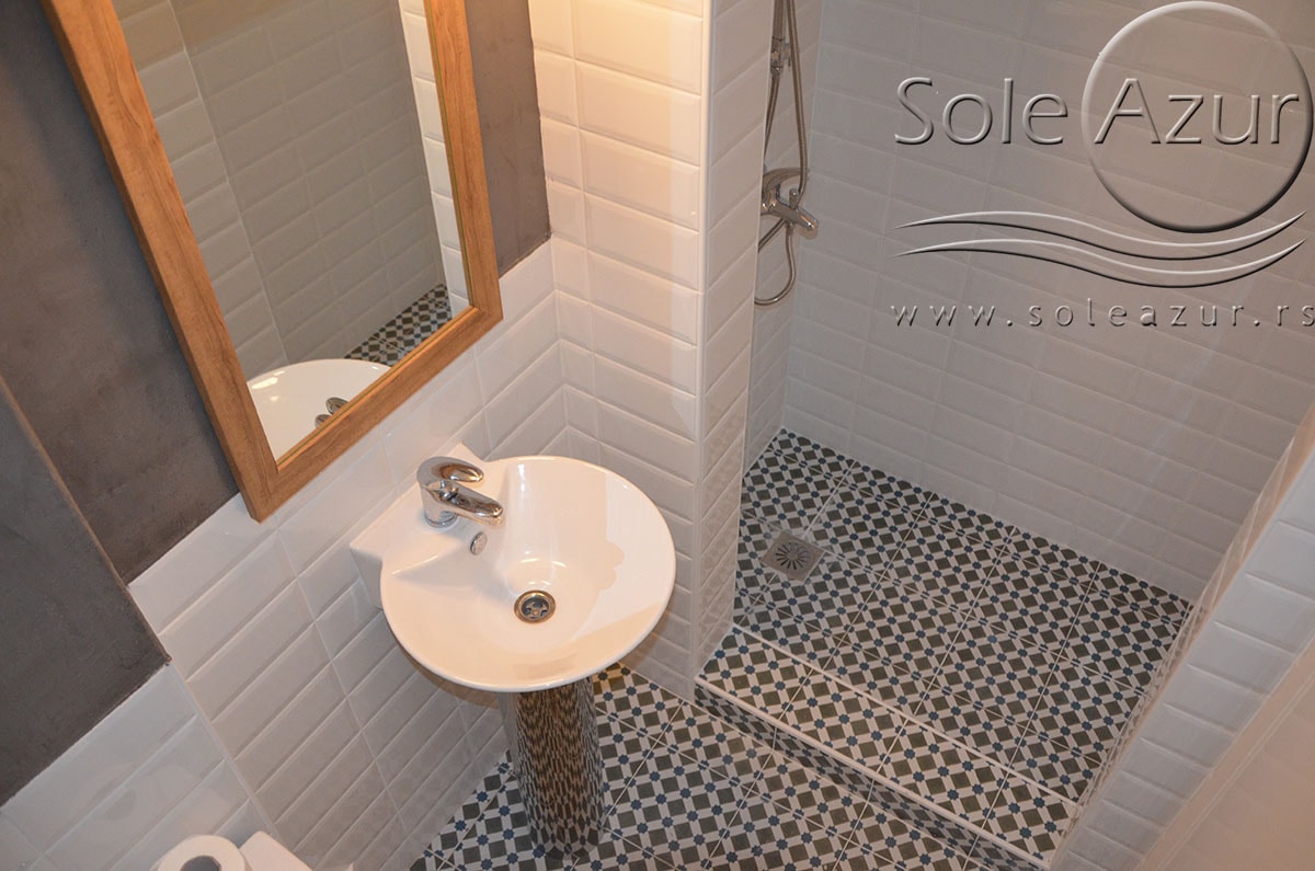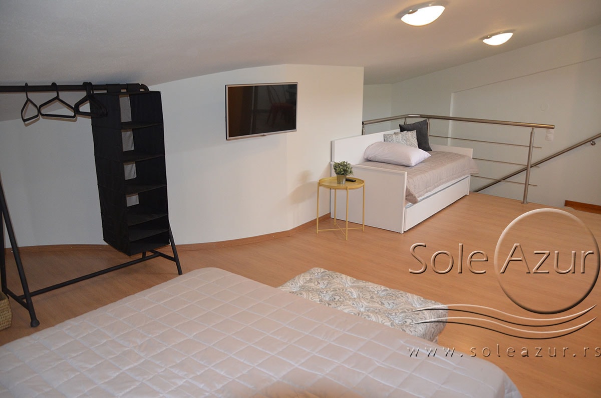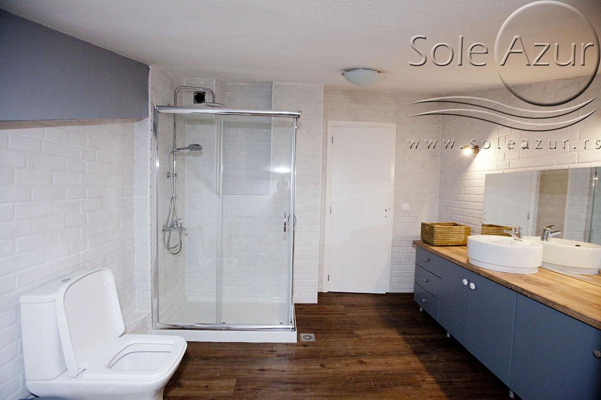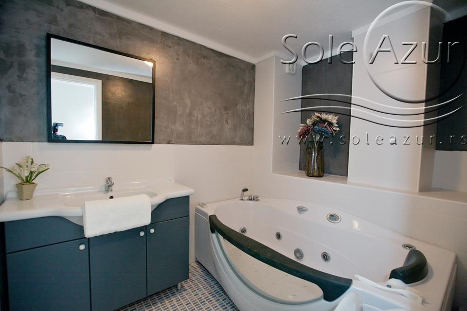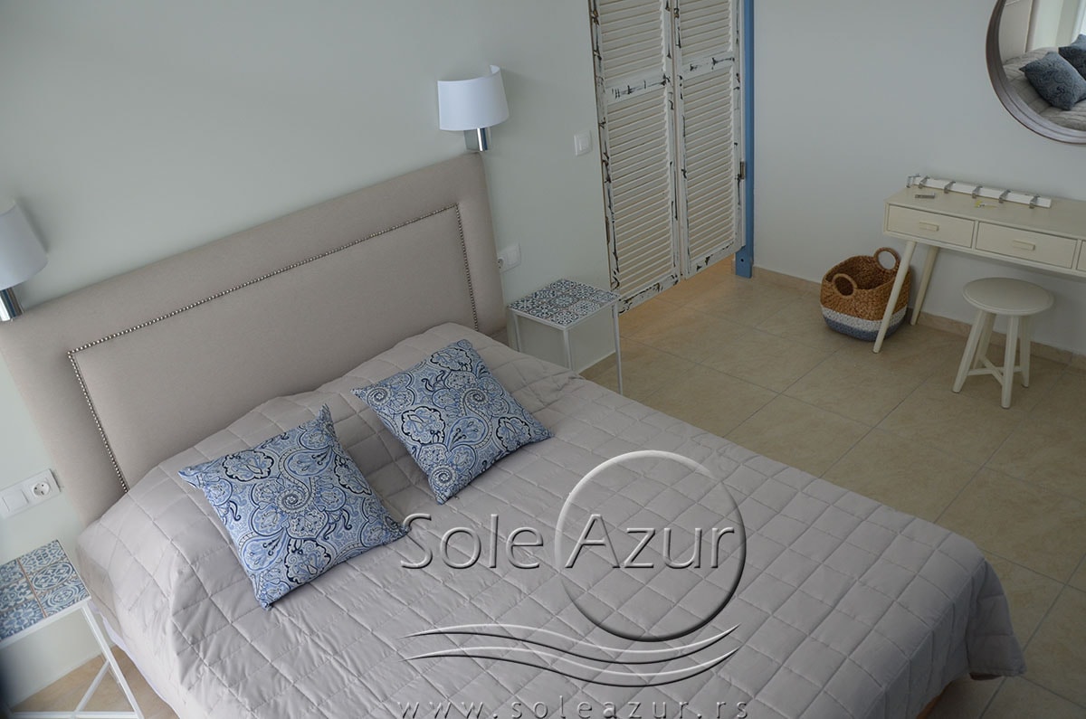 TROKREVETNI i ČETVOROKREVETNI STUDIO (2 sprat): trokrevetni i četvorokrevetni studio u svom sastavu poseduju jedan francuski ležaj (dimenzija 200x160cm), prostor za odlaganje stvari (pitati u agenciji), manji ormar, TV, klima uređaj, sofu za sedenje, koja je ujedno i ležaj za treću osobu (dimenzija 190x80cm). Iz sofe se izvlači još jedan ležaj (dimenzija 185x75cm), tako da mogu da spavaju četiri osobe. U sklopu prostorije se nalazi kuhinja, koja je u potpunosti opremljena posuđem za tri/četiri osobe. Poseduje i frižider, šporet sa dve ringle, aspirator. Kupatilo je veliko i sadrži zastakljenu tuš kabinu. Studio poseduje terasu sa stolom i četiri stolice, ali zbog svoje specifičnosti naglasavamo da terasa nema pogled, jer su zidovi sa tri strane, ali postoji i tenda koja zaklanja sunce po potrebi.