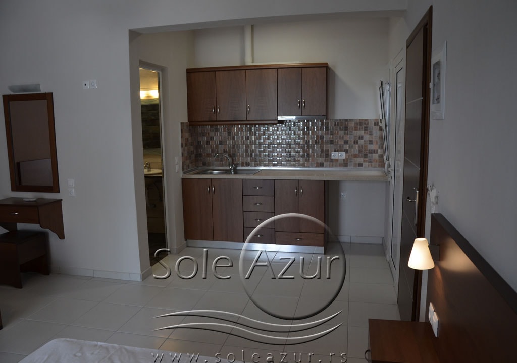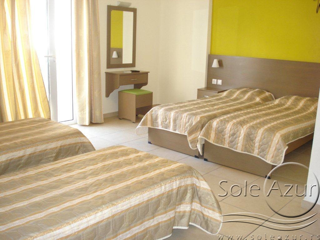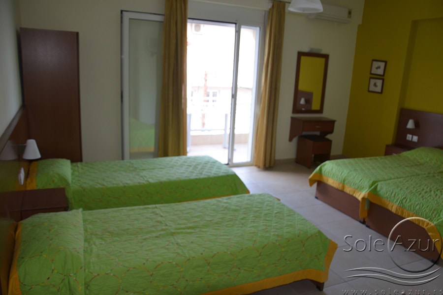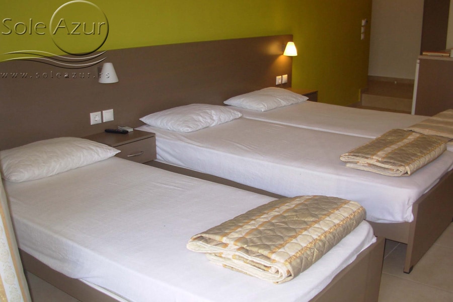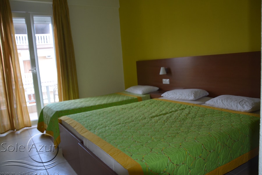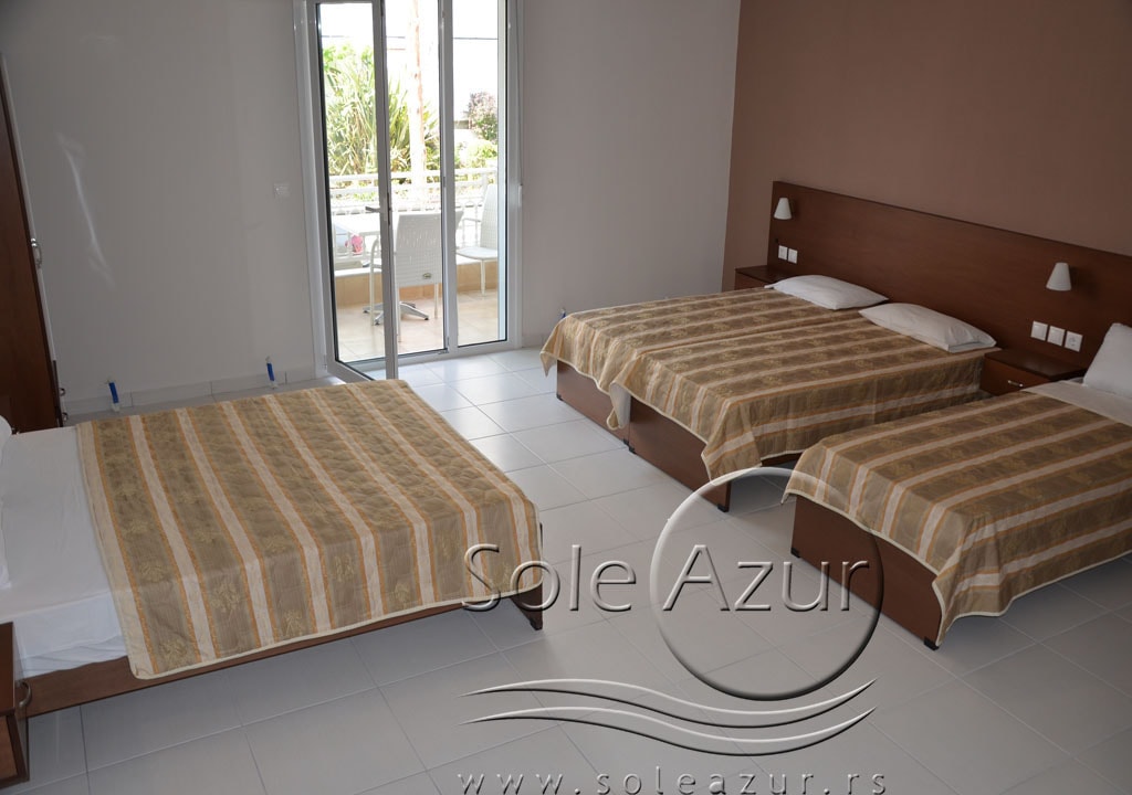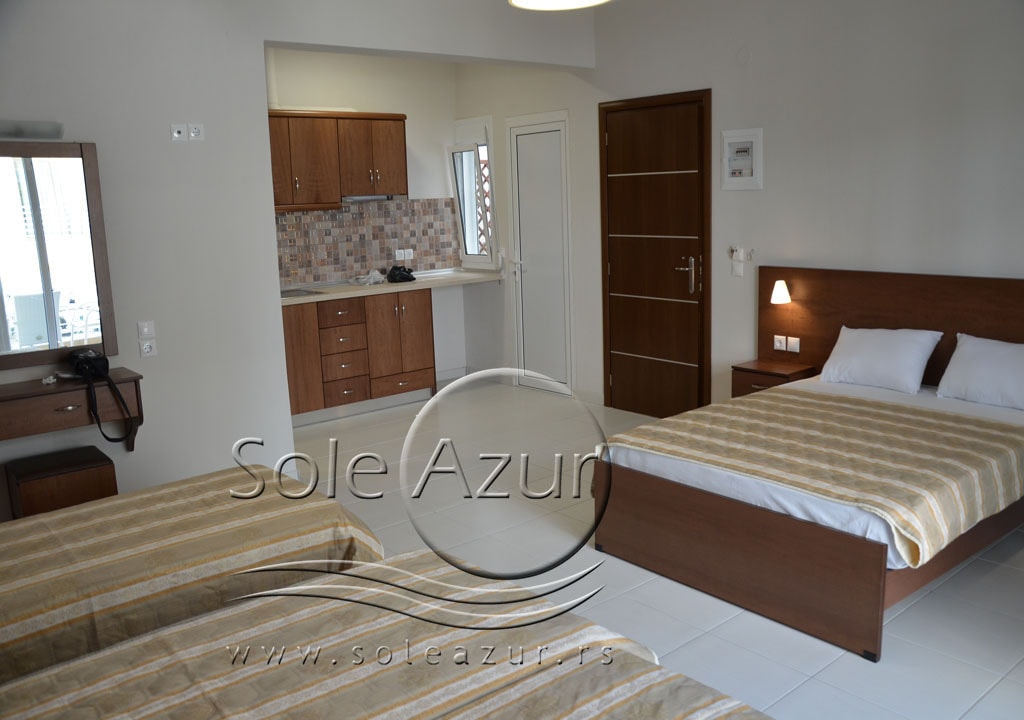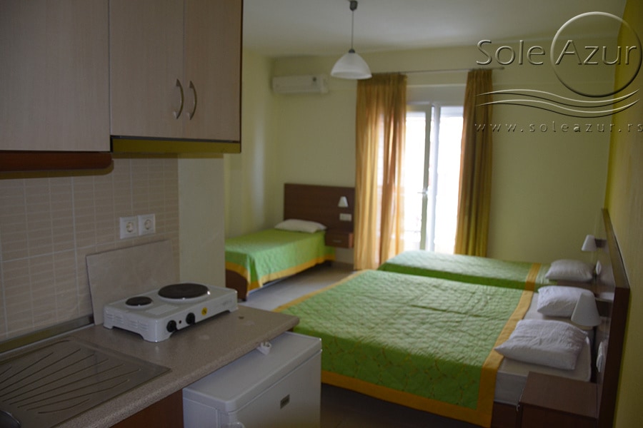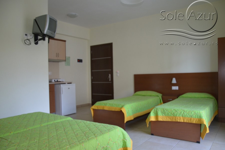 TROKREVETNI STUDIO: Trokrevetni studiji u svom sastavu poseduju ili tri singl standardna ležaja, ili dva spojena singl standardna ležaja i jedan odvojeni singl standardni ležaj, TV/KAT, ormar, noćni stočić, A/C (klima uređaj) URAČUNAT U CENU, BESPLATNU wi-fi internet konekciju, kompletno opremljenu kuhinju sa rešoom sa dve ringle, frižider, aspirator; Kupatilo sa TUŠ/WC. Studiji su veoma konforni i svi studiji imaju izuzetno lepu terasu sa stolom i tri stolice, sa koje se pruža pogled na more.