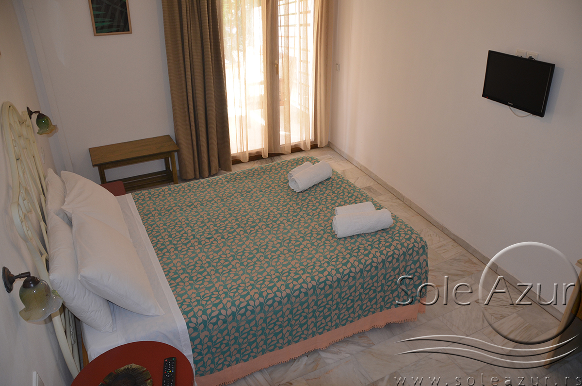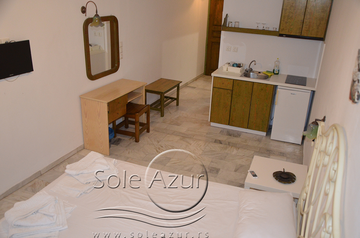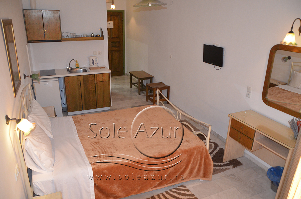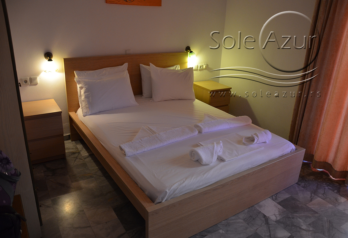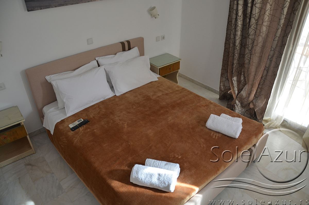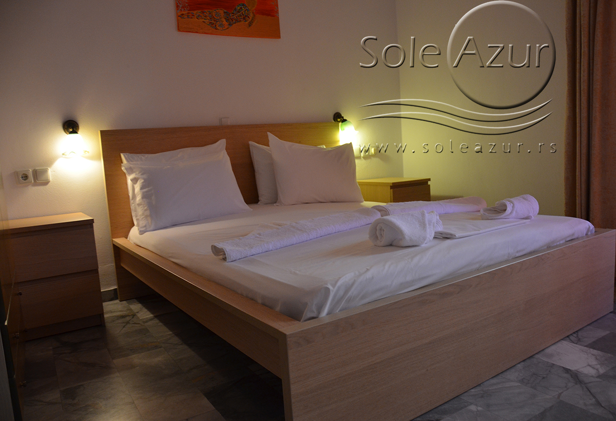DVOKREVETNI STUDIJI: Dvokrevetni studiji u svom sastavu poseduju ili francuski ležaj dimenzija 190x155cm ili dva singl standardna ležaja dimenzija 190x90cm, dva noćna stočića, stočić sa ogledalom, stočić za prtljag, TV, klima uređaj, orman, SEF (BESPLATNO korišćenje), WI-FI internet konekcija (BESPLATNO korišćenje). Kuhinja se sastoji od ugradnog šporeta sa dve ringle, frižidera sa malom komorom za zamrzavanje, ketlera za grejanje vode, aspiratora, posuđa za dve osobe i stolom za ručavanje sa dve stolice. Kupatila su potpuno renovirana i u svom sastavu poseduju Tuš kabinu, fen za kosu, jedan mali i jedan veliki peškir po osobi.