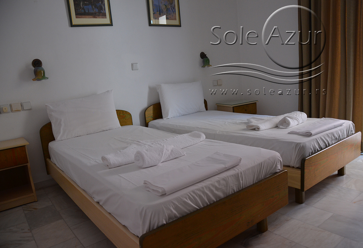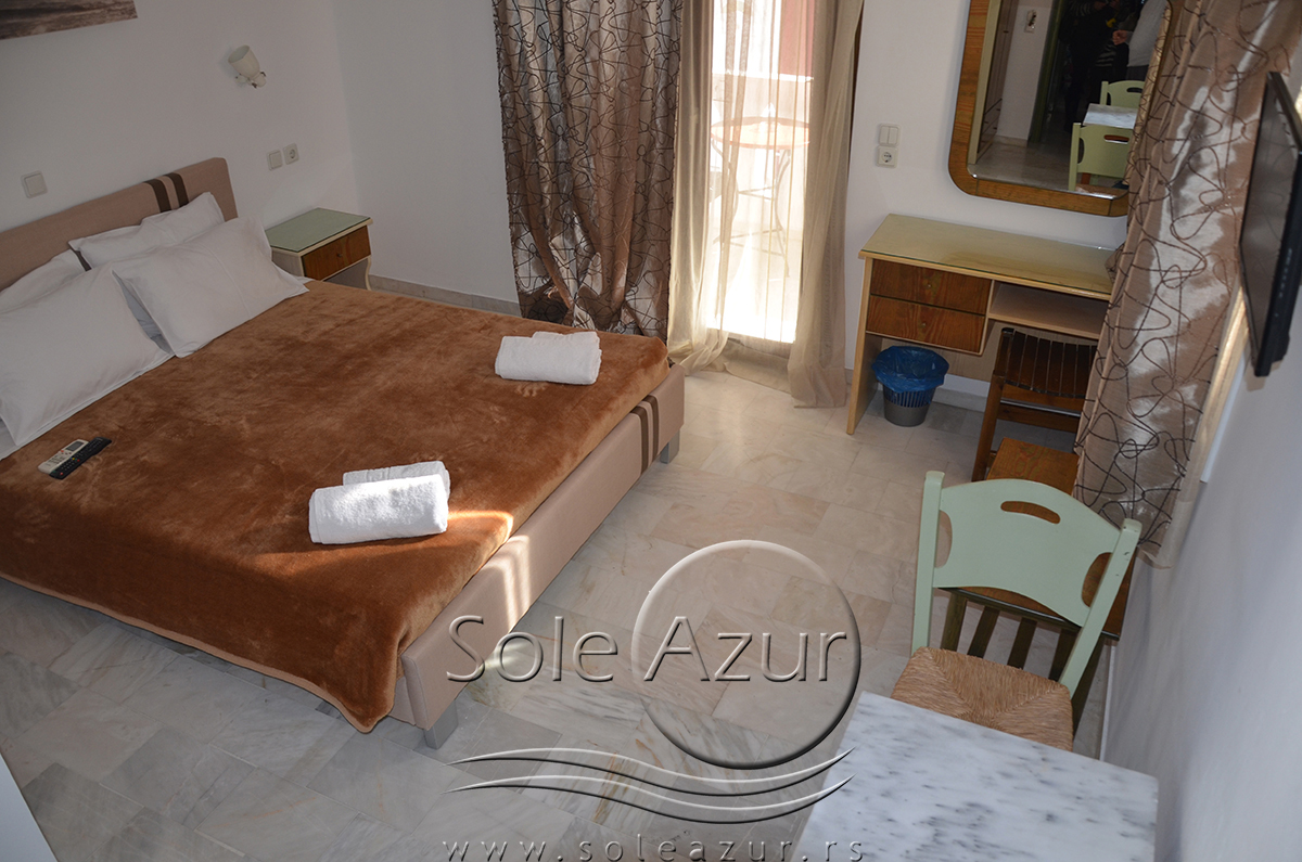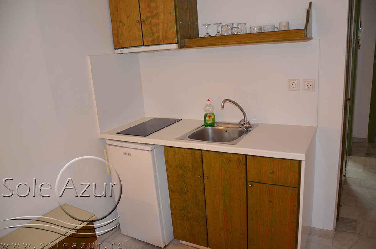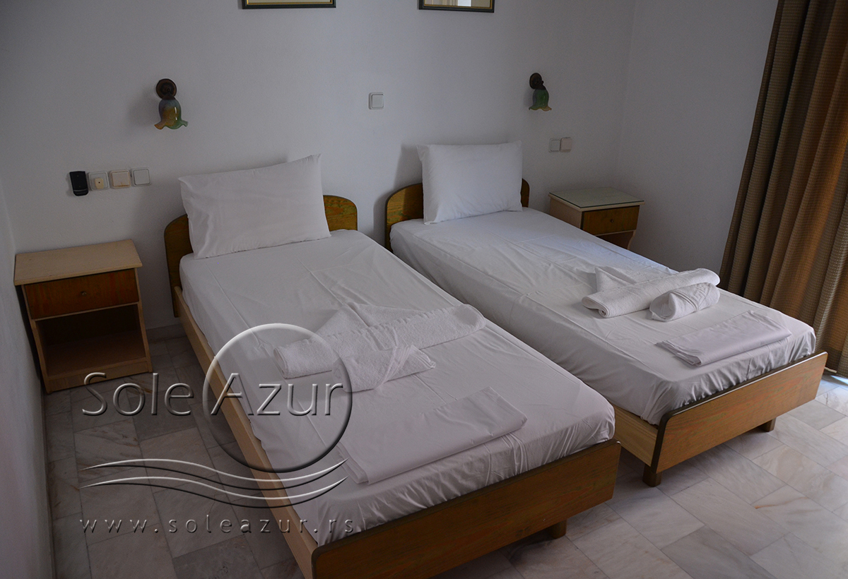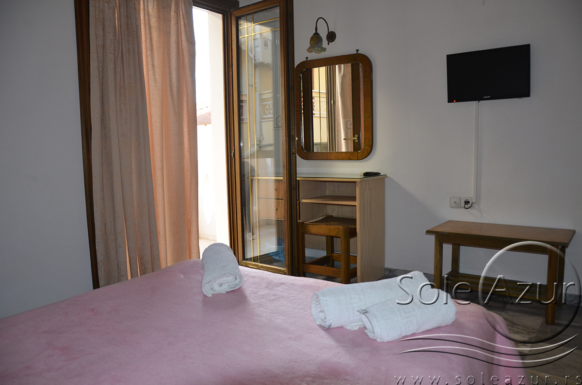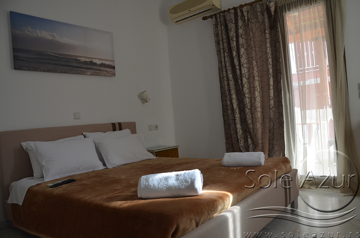 DVOKREVETNI STUDIJI: Dvokrevetni studiji u svom sastavu poseduju ili francuski ležaj dimenzija 190x155cm ili dva singl standardna ležaja dimenzija 190x90cm, dva noćna stočića, stočić sa ogledalom, stočić za prtljag, TV, klima uređaj, orman, SEF (BESPLATNO korišćenje), WI-FI internet konekcija (BESPLATNO korišćenje). Kuhinja se sastoji od ugradnog šporeta sa dve ringle, frižidera sa malom komorom za zamrzavanje, ketlera za grejanje vode, aspiratora, posuđa za dve osobe i stolom za ručavanje sa dve stolice. Kupatila su potpuno renovirana i u svom sastavu poseduju Tuš kabinu, fen za kosu, jedan mali i jedan veliki peškir po osobi.
