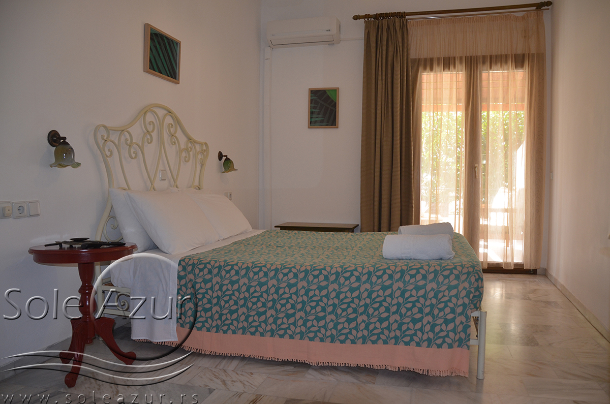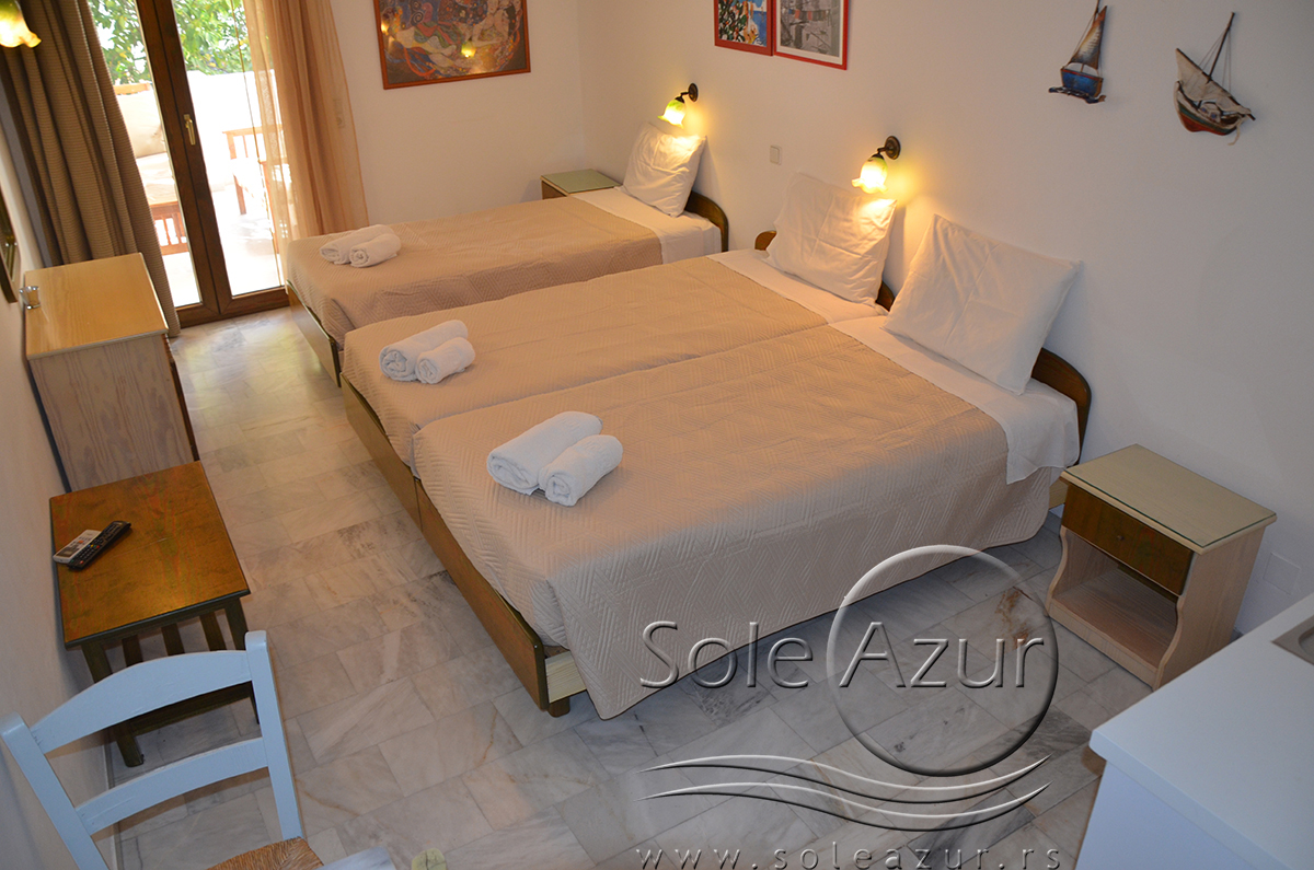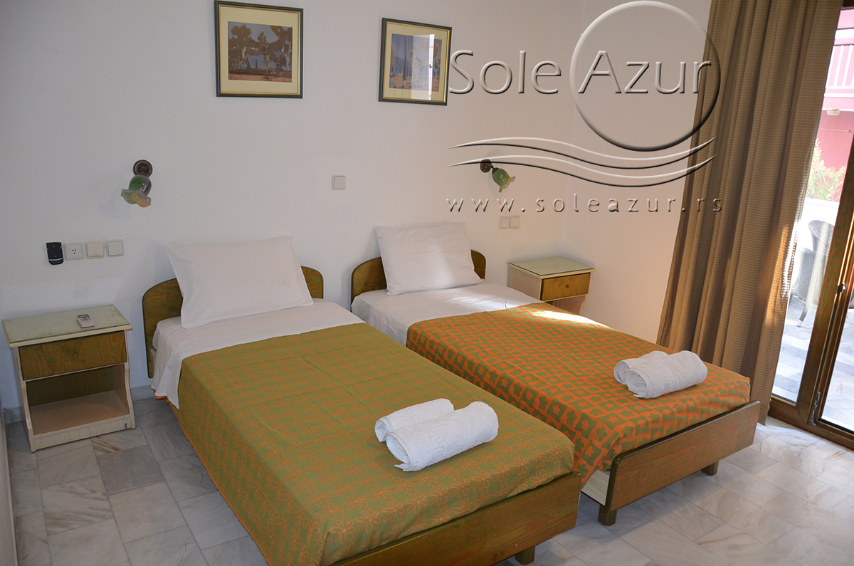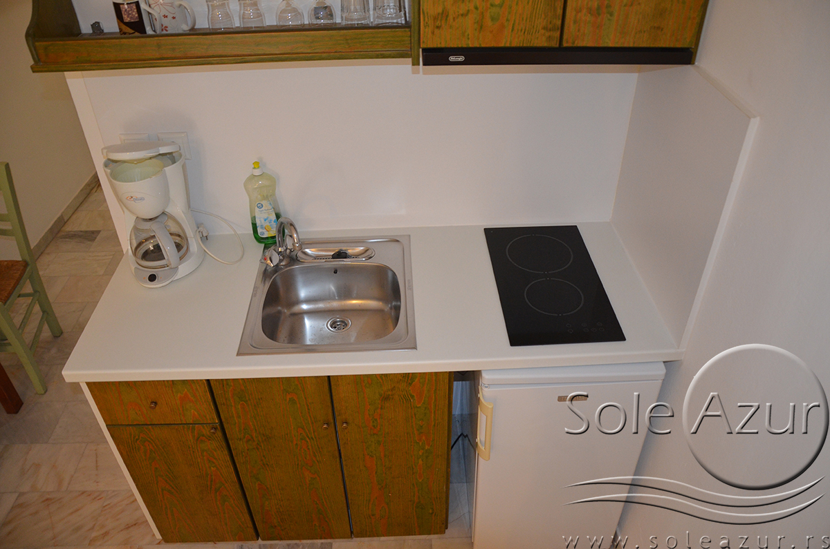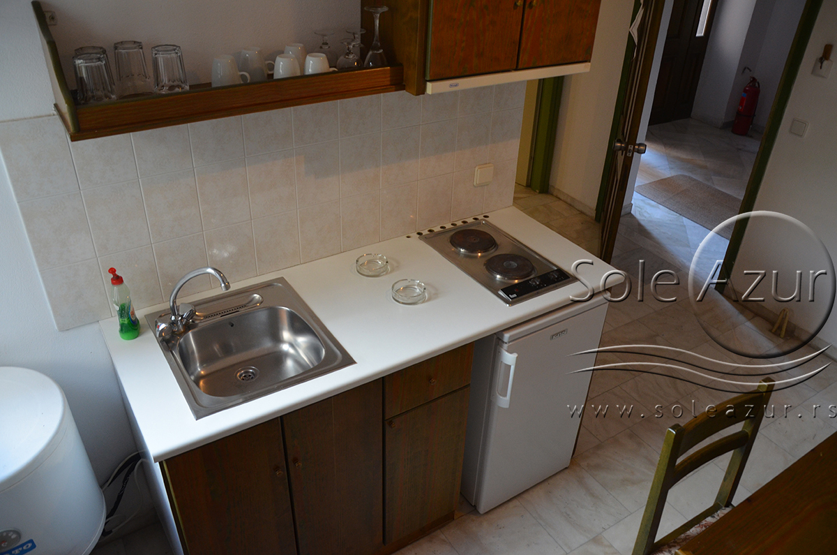 DVOKREVETNI STUDIJI: Dvokrevetni studiji u svom sastavu poseduju ili francuski ležaj dimenzija 190x155cm ili dva singl standardna ležaja dimenzija 190x90cm, dva noćna stočića, stočić sa ogledalom, stočić za prtljag, TV, klima uređaj, orman, SEF (BESPLATNO korišćenje), WI-FI internet konekcija (BESPLATNO korišćenje). Kuhinja se sastoji od ugradnog šporeta sa dve ringle, frižidera sa malom komorom za zamrzavanje, ketlera za grejanje vode, aspiratora, posuđa za dve osobe i stolom za ručavanje sa dve stolice. Kupatila su potpuno renovirana i u svom sastavu poseduju Tuš kabinu, fen za kosu, jedan mali i jedan veliki peškir po osobi.