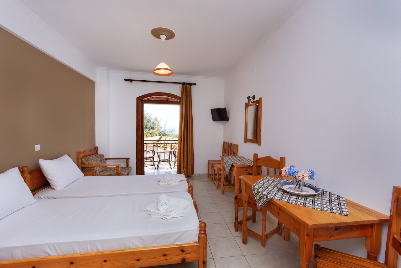 DVOKREVETNI STUDIJI: Dvokrevetni studiji se sastoje iz prostorije u kojoj se nalaze dva singl standardna ležaja dimenzija 90x190cm, dva noćna stočića, ormar, dve lampe, TV, klima uređaj, Kuhinja se nalazi u sklopu studija i od opreme poseduje rešo sa dve ringle, sudoperu, kao i neophodan kuhinjski pribor za dve osobe. Kupatilo u svom sastavu ima tuš kabinu , kao i po jedan veliki i jedan mali peškir po gostu. Terasa je komforna, i poseduje sto sa dve stolice. Usluga WI-FI internet konekcije je besplatna.